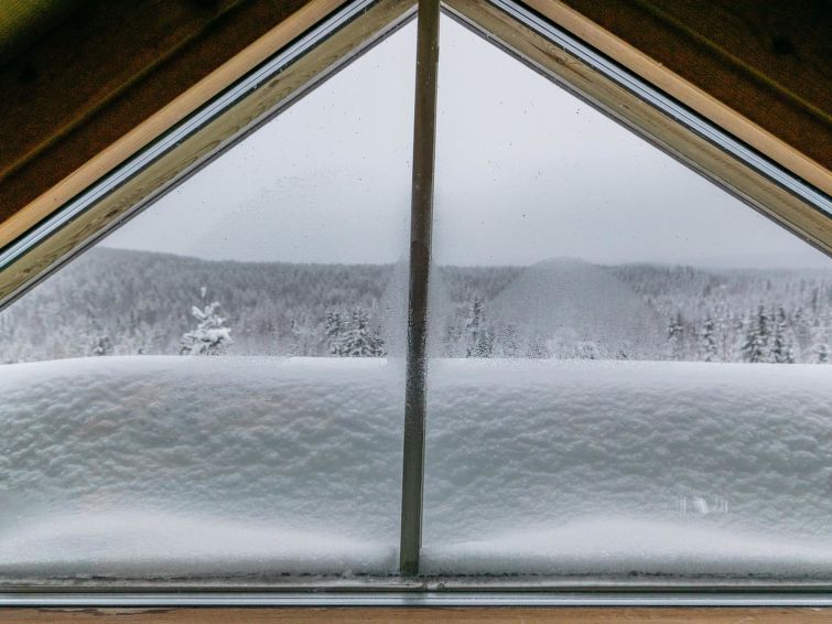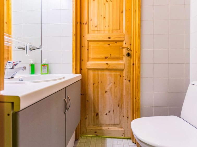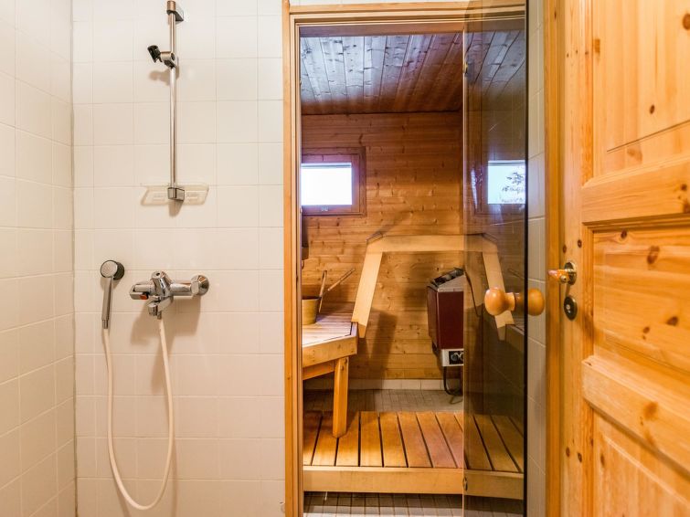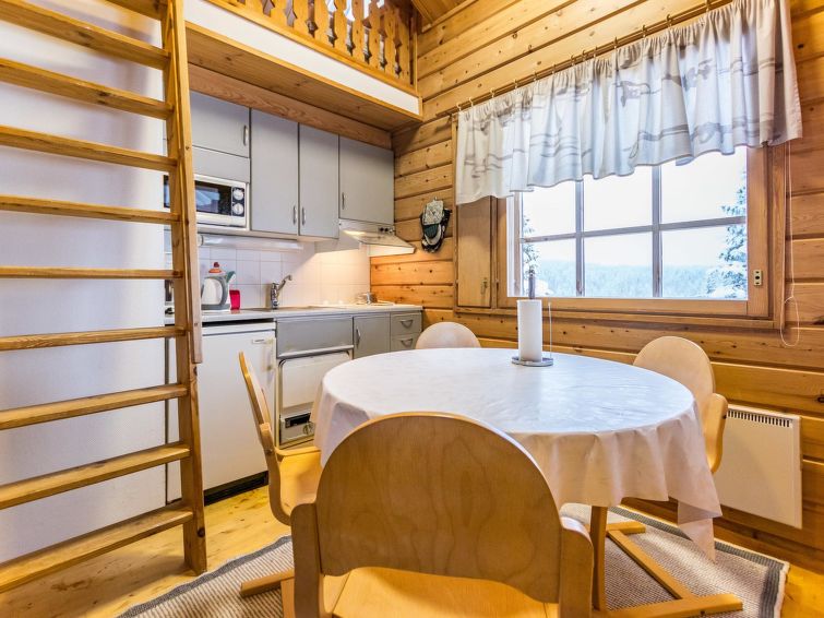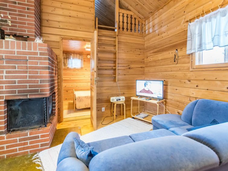 3,3 km / 2,05 mi from Paljakka ski centre. Distance to Lake Rakennusjärvi 3 km / 1.86 mi (1 km / 0.62 mi long and 200 m / 219 yds wide). Semi-detached chalet of massive logs, built in 1994. Bedroom with double bed, kitchenette and living room, sauna with adjoining dressing room, WC, loft with 2 beds and another loft with 3 mattresses. Steep stairs to the lofts.
