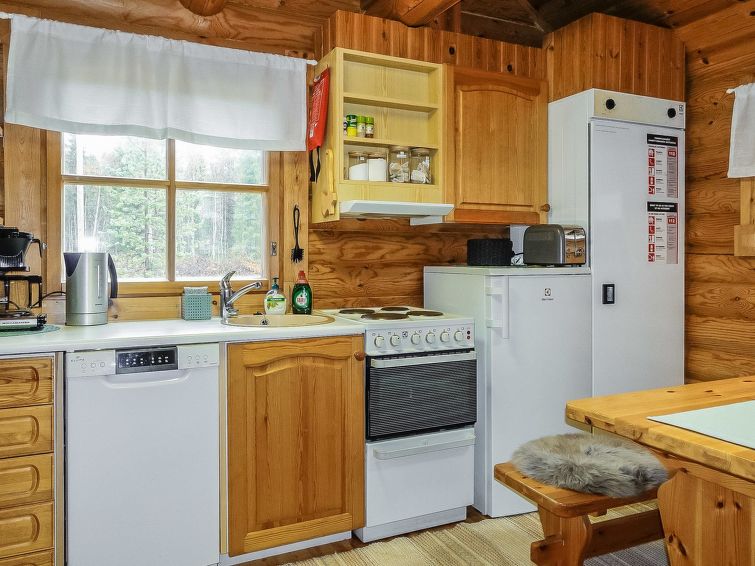 Round log cabin, built in 1992. Living room/kitchen, double bed in alcove, two mattresses in the loft, steep stairs to the loft, sauna, washroom/WC and covered porch. The alcove is spacious, like a bedroom, but there is no door. Alcove is separated from other space by a curtain.