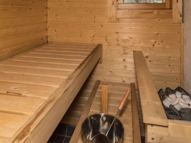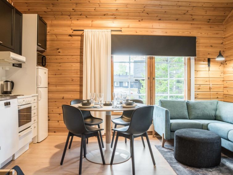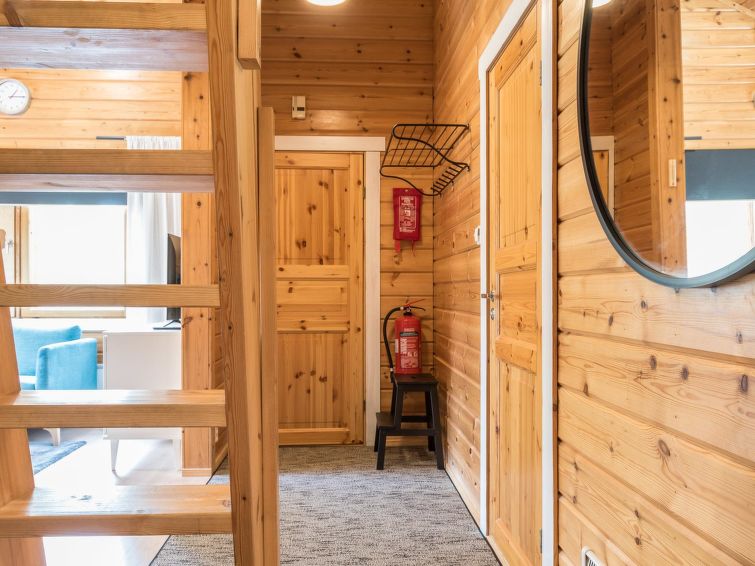 A log duplex apartment located 165 km north of Rovaniemi in Ylläsjärvi village Palovaara area. Built 1987. Near the services of Hotel Ylläsrinne. Livingroom/kitchen, bedroom 1: double bed, bedroom 2: 2 beds, electric sauna, washing room, terrace, storage room, toilet, Wi-Fi. Loft is not suitable for accommodation because of lack of emergency exit.