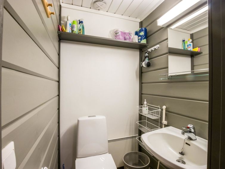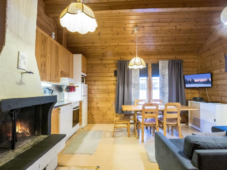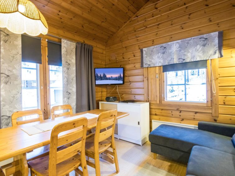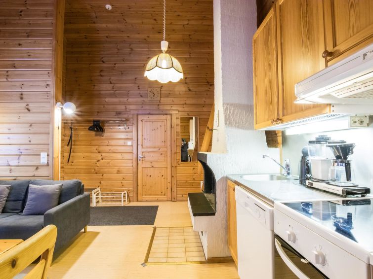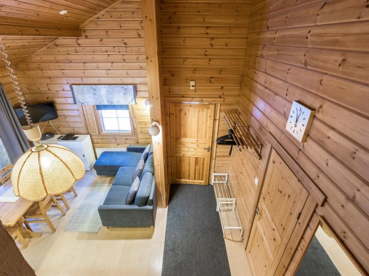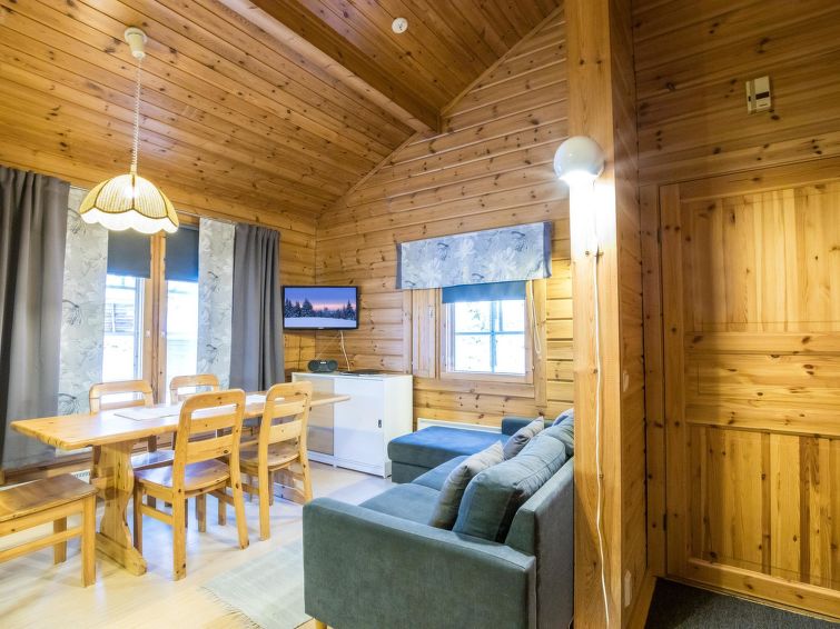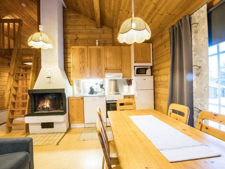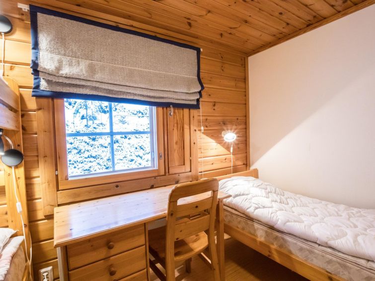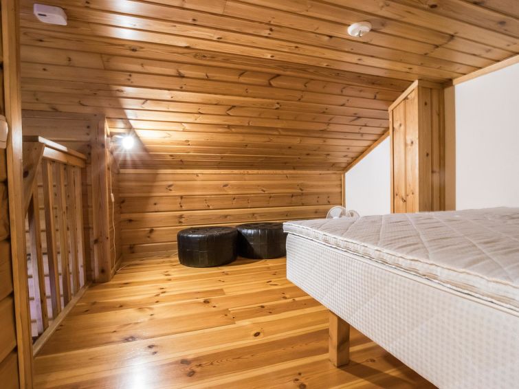 40 km North-East of Kolari, lake Ylläsjärvi 2,5 km, swimming beach 4 km. Log duplex apartment 1989. Livingroom/kitchen, two bedrooms, on with a double bed and one with a bunk bed and a separate bed, loft (9 m², steep stairs) with 2 beds. Electric sauna, shower, separate toilet. Open porch. Homely duplex apartment located in the Ylläsjärvi village Palovaara area. Location ideal for winter sports. Hiking routes nearby. Hotel Ylläsrinne is the closest hotel. No pets allowed. Prices include final cleaning, bed linen available for rent.