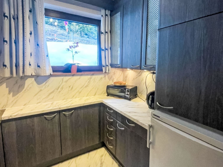 5 rom hus 100 m2 på 2 etasjer, på bakkeplan. Rustikt og koseligt møbler: inngang. Stue/spisestue med, spisehjørne og satelit-TV (flatskjerms TV), radio og kakkelovn. Utgang til hagen, til terrassen. 1 rom med 2 senger. 1 dobblet rom. Lite kjøkken (stekeovn, 2 induksjonskomfyr, elektrisk kaffemaskin). Dusj/WC. El-oppvarming, vedoppvarming vannkoker (200 liter). Toppetasje: 1 dobblet rom med, vaskeservant. 1 dobblet rom. Terrasse 11 m2. Balkongmøbler. Vakker utsikt av fjellene. Fasiliteter: høy barnestol barneseng for barn opp til 3 år, hårføner. Internett (trådløs LAN [WLAN], gratis). Vennligst merk: velegnet for familier. Røykfritt hus. Røykvarsler.