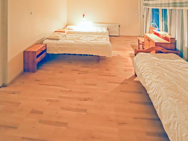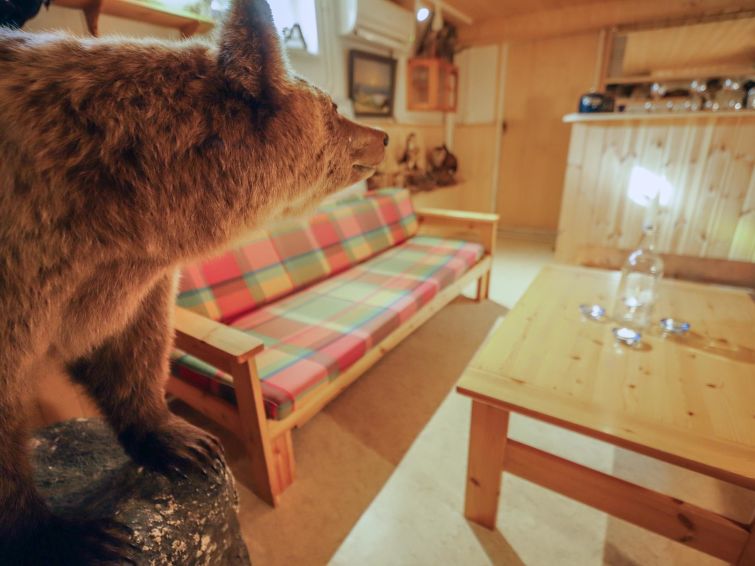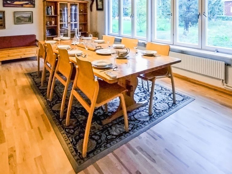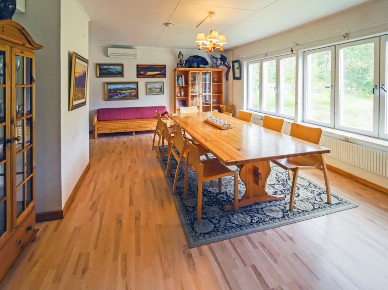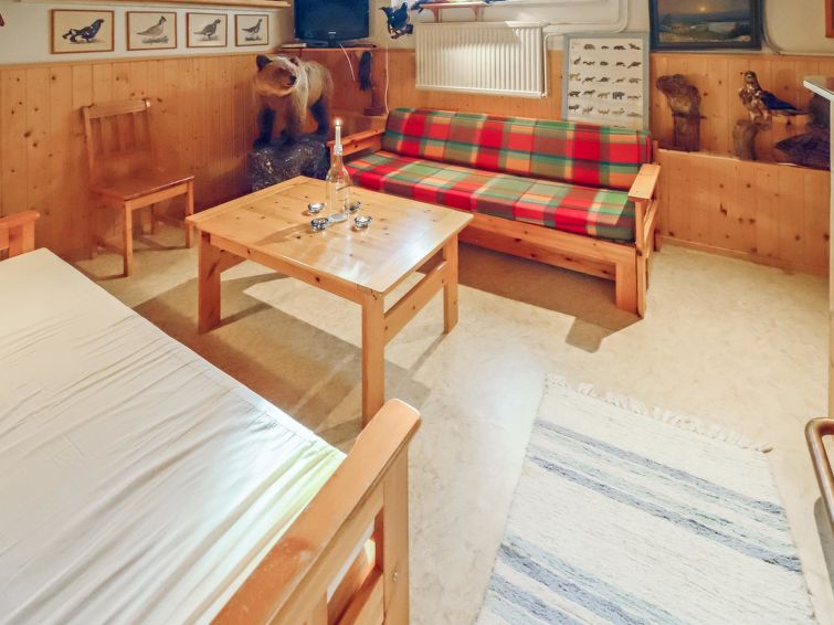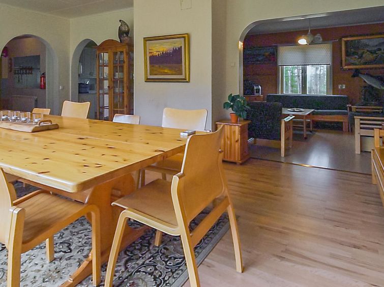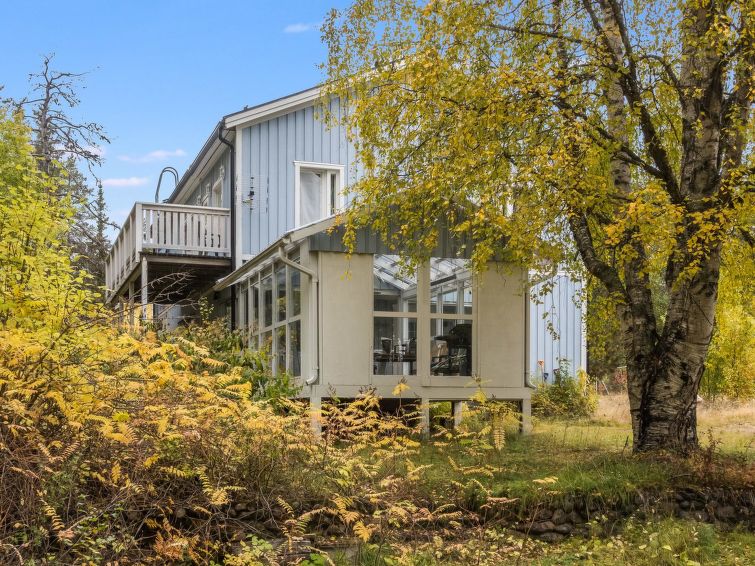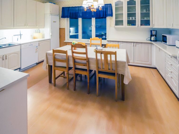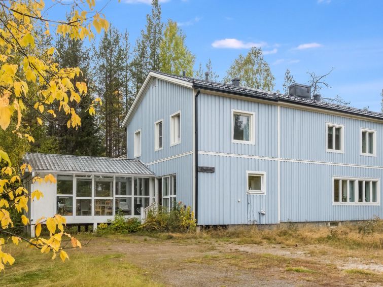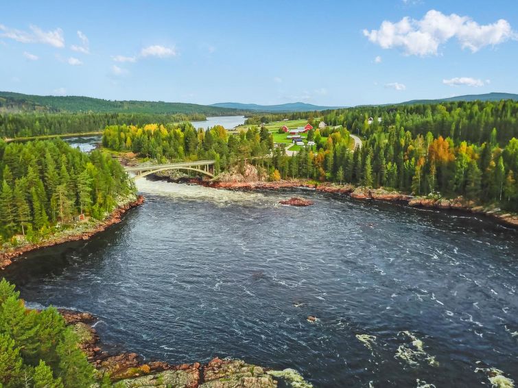 Wooden house 1938, renovated 2008, rooms on 3 storeys, kitchen, dining room/living room, TV room, “hunters’ bar”, 4 bedrooms each with 2 beds (one room with own WC and shower), 2 bedrooms each with 2 beds plus top bunk, 1 bedroom 1 bed, sauna, washroom, room with fireplace, glazed terrace, large open balcony. House has total of 6 showers, WC facilities also upstairs, equipment includes spin drier. More extra beds by arrangement. Spacious, fully renovated ‘salmon fishing cabin’ in peaceful village setting. Located right next to a natural salmon river and a spectacular waterfall. Good fishing places below the waterfall approx. 150 m from cabin! Length of fishing area10 km (salmon, trout, grayling, etc.). Equipment includes fish smoking oven and sand pit for pit-roasting meat.