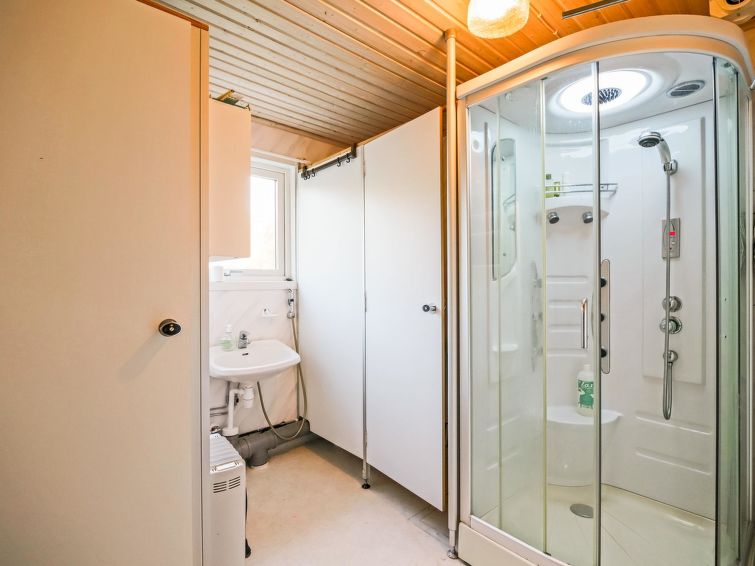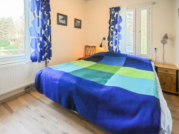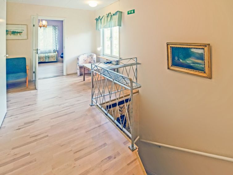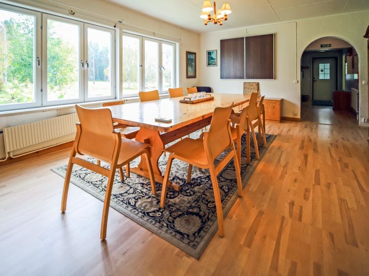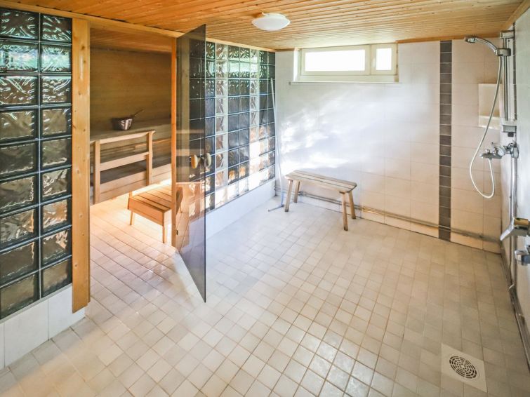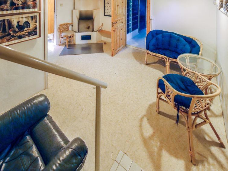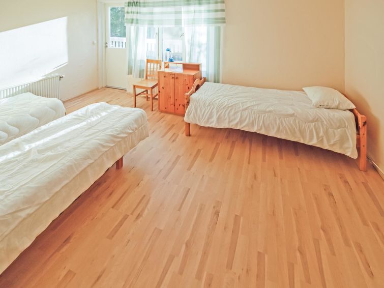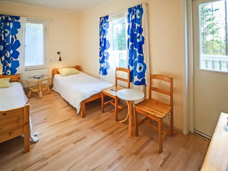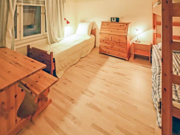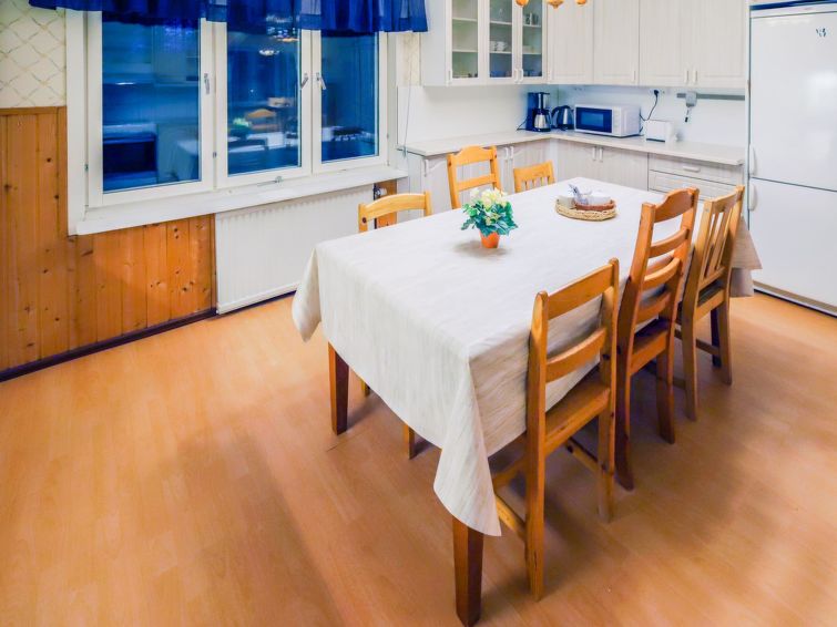 Wooden house 1938, renovated 2008, rooms on 3 storeys, kitchen, dining room/living room, TV room, “hunters’ bar”, 4 bedrooms each with 2 beds (one room with own WC and shower), 2 bedrooms each with 2 beds plus top bunk, 1 bedroom 1 bed, sauna, washroom, room with fireplace, glazed terrace, large open balcony. House has total of 6 showers, WC facilities also upstairs, equipment includes spin drier. More extra beds by arrangement. Spacious, fully renovated ‘salmon fishing cabin’ in peaceful village setting. Located right next to a natural salmon river and a spectacular waterfall. Good fishing places below the waterfall approx. 150 m from cabin! Length of fishing area10 km (salmon, trout, grayling, etc.). Equipment includes fish smoking oven and sand pit for pit-roasting meat.