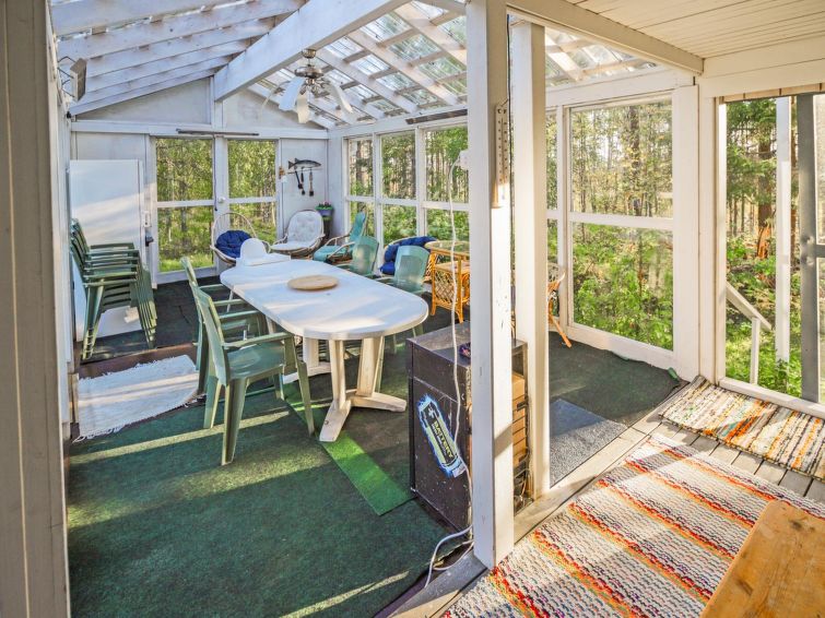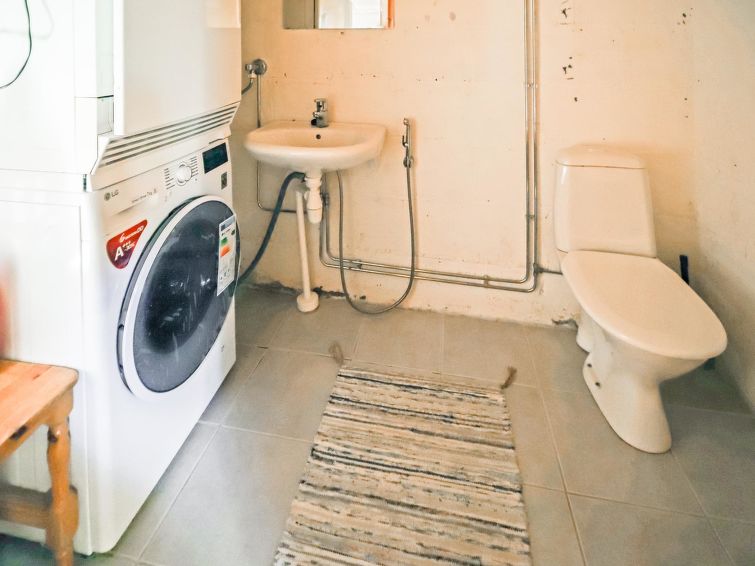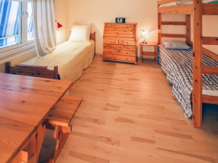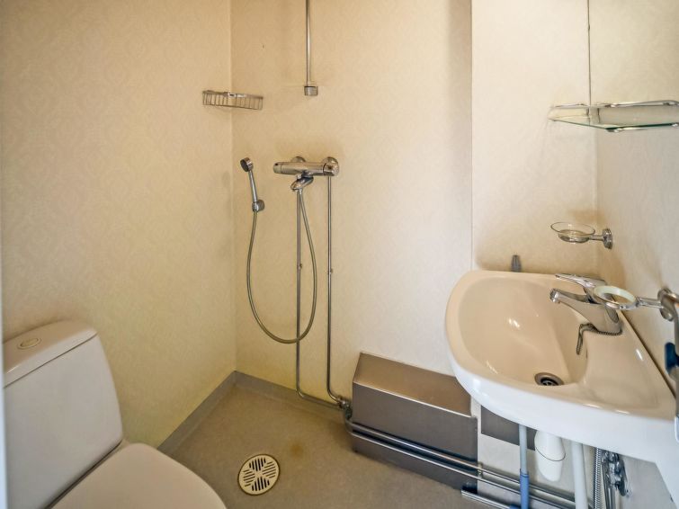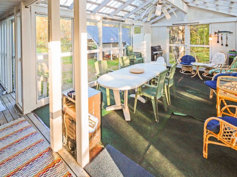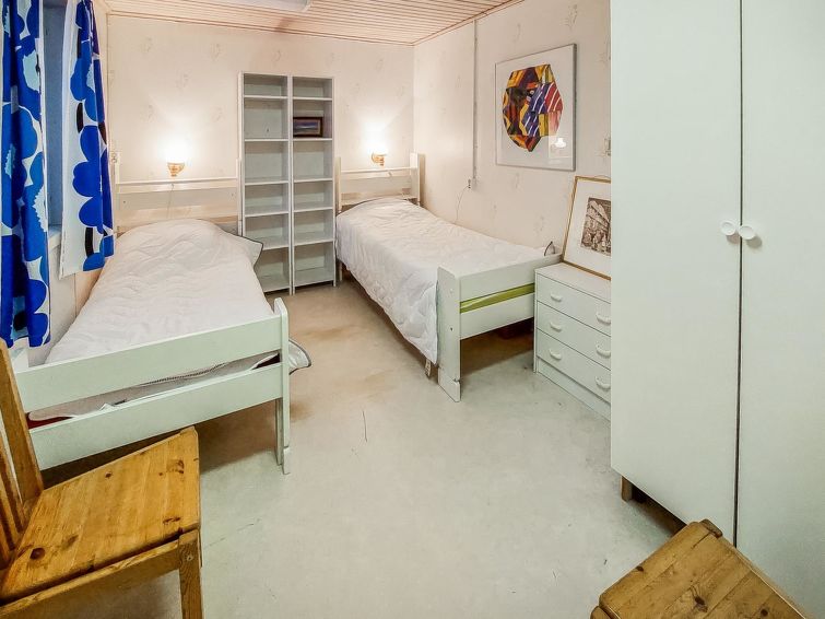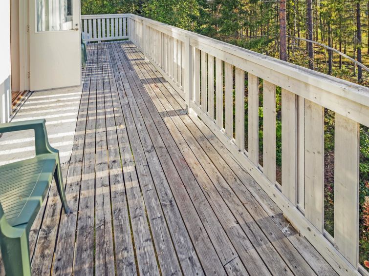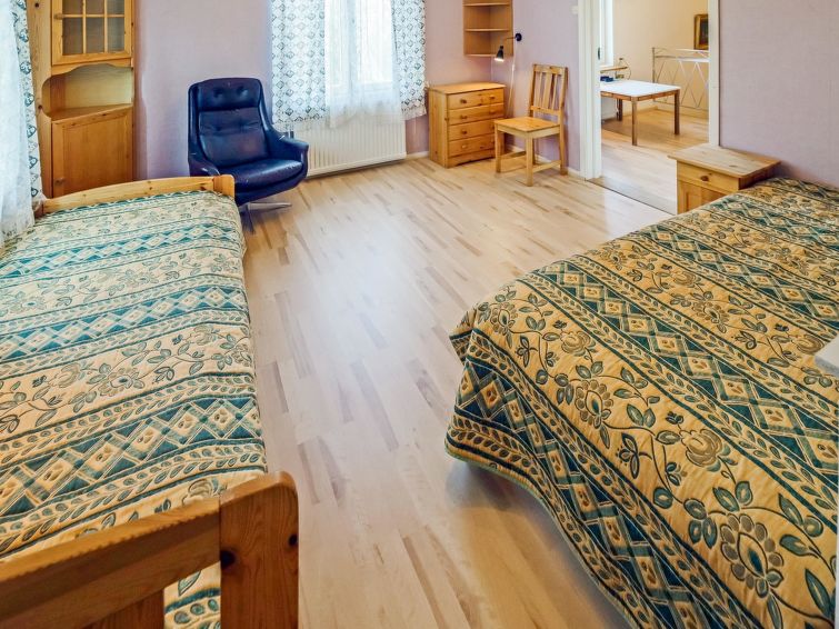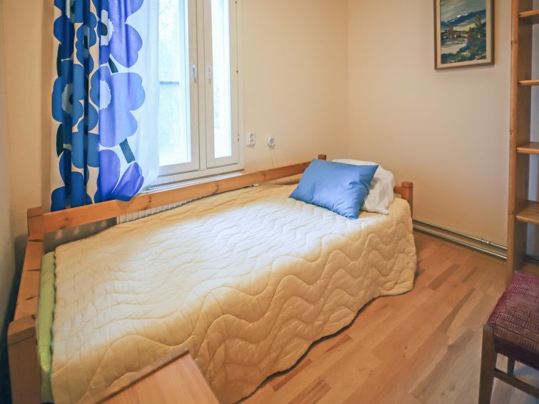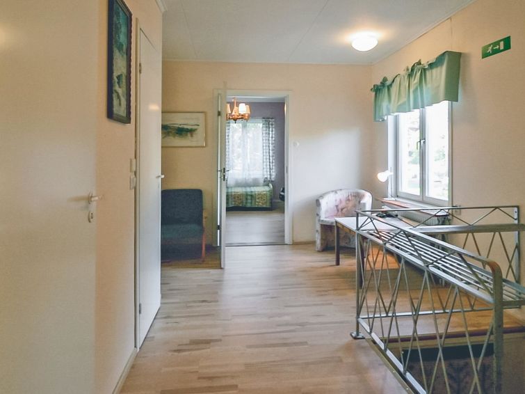 Wooden house 1938, renovated 2008, rooms on 3 storeys, kitchen, dining room/living room, TV room, “hunters’ bar”, 4 bedrooms each with 2 beds (one room with own WC and shower), 2 bedrooms each with 2 beds plus top bunk, 1 bedroom 1 bed, sauna, washroom, room with fireplace, glazed terrace, large open balcony. House has total of 6 showers, WC facilities also upstairs, equipment includes spin drier. More extra beds by arrangement. Spacious, fully renovated ‘salmon fishing cabin’ in peaceful village setting. Located right next to a natural salmon river and a spectacular waterfall. Good fishing places below the waterfall approx. 150 m from cabin! Length of fishing area10 km (salmon, trout, grayling, etc.). Equipment includes fish smoking oven and sand pit for pit-roasting meat.