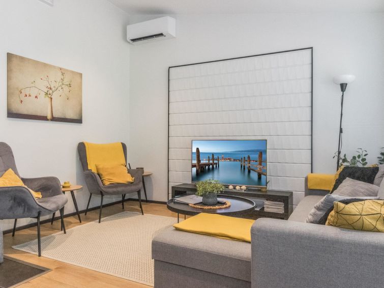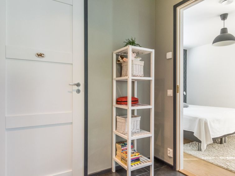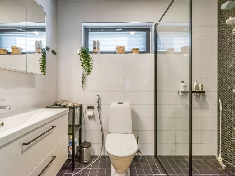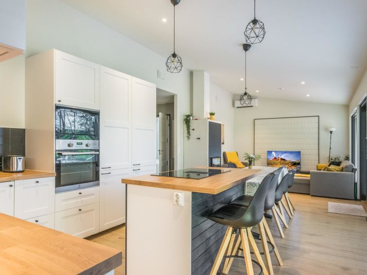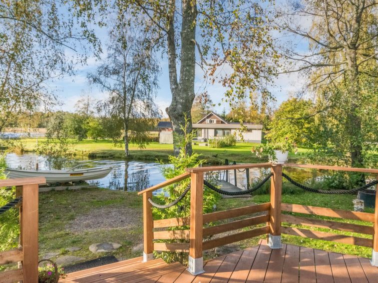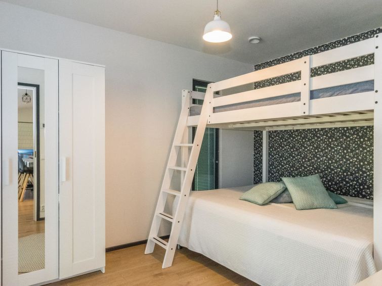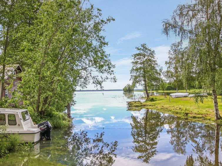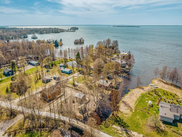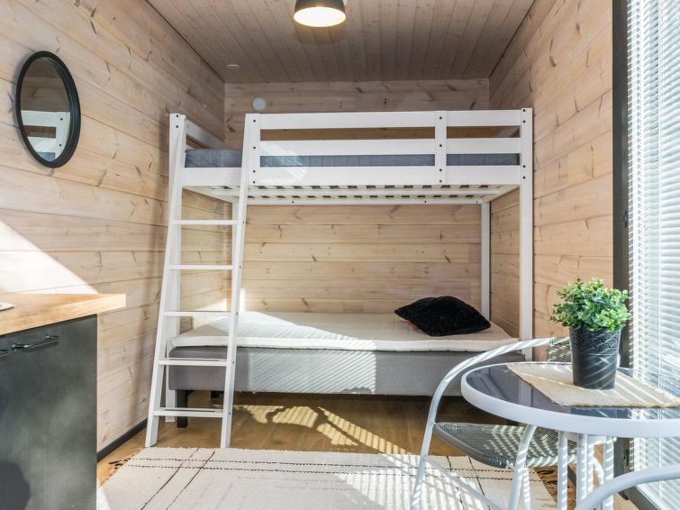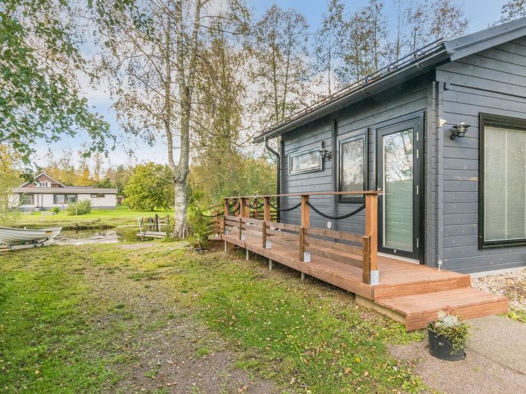 70 km to the north from Turku, Lake Pyhäjärvi 30 m, shallow sandy riverbank, a small pier, and a rowing boat. Wooden cabin (built in 2021), combined living room and kitchen, two bedrooms; one with a double bed, and the other with a bunk bed where the lower bed is 160 x 200 cm and the upper bed is 140 x 200 cm. The living room has a sofa bed that can be extended to a size of 140 x 190 cm. The cabin also features a utility room with a washing machine and WC/shower room with two showers. The living room has an air-source heat pump for cooling/heating.
