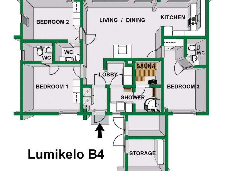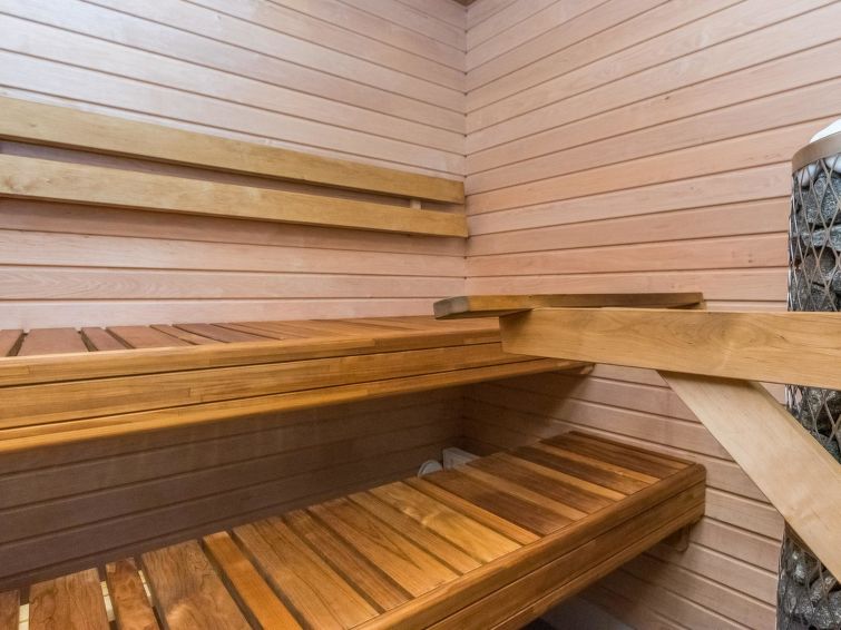 Three bedrooms offer a peaceful night's rest, each with two beds and a private toilet. In addition, it is possible to relax in the warmth of the sauna and enjoy the practicality of the washroom/utility room.