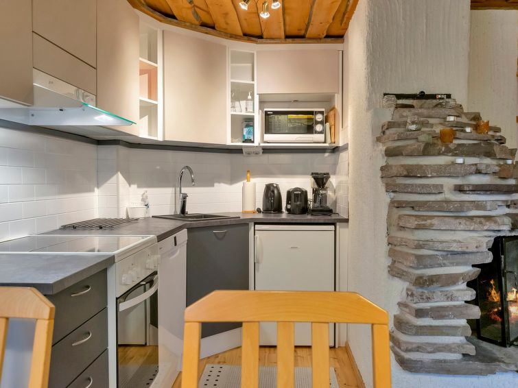 45 km north of Kemijärvi, located in Pyhätunturi Ski resort. Silverlog row house apartment built in 1990. Open concept living room kitchen, small bedroom with 2 beds ( 2x80 cm), sleeping loft (to which steep stairs) with 3 beds, renovated washroom and sauna (elec. stove).