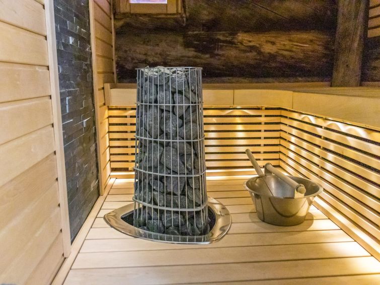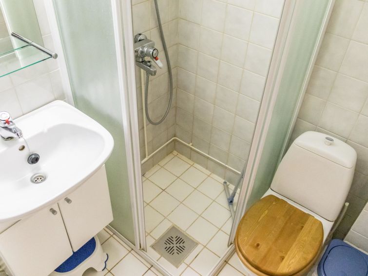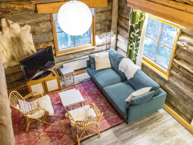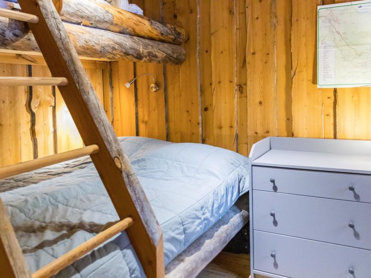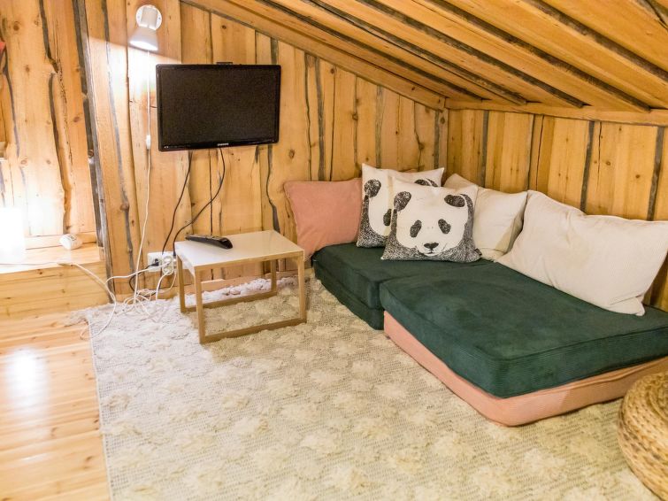 Silverlog row house apartment built in 1990. Living room, kitchen, bedroom bunked bed (bottom 140cm, upper bed 80cm), sleeping loft (to which steep stairs) 160cm double bed, washroom, sauna (elec. stove). There is a small book and DVD library. Separate food freezer is in the sleeping loft upstairs.