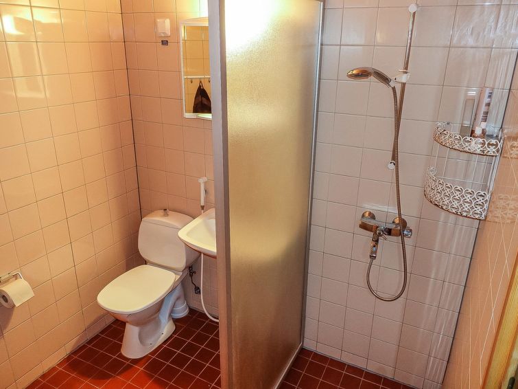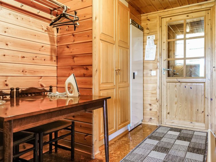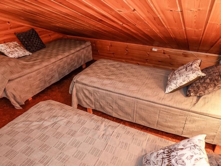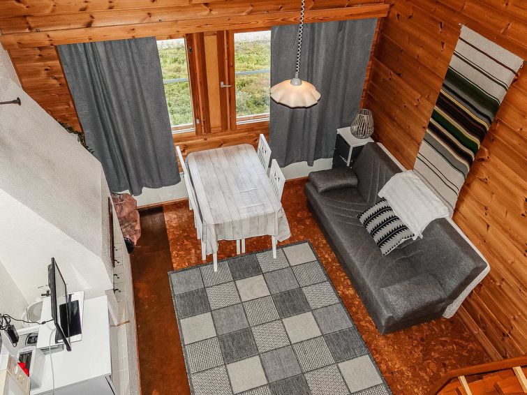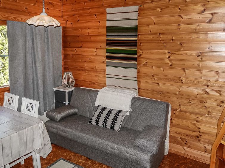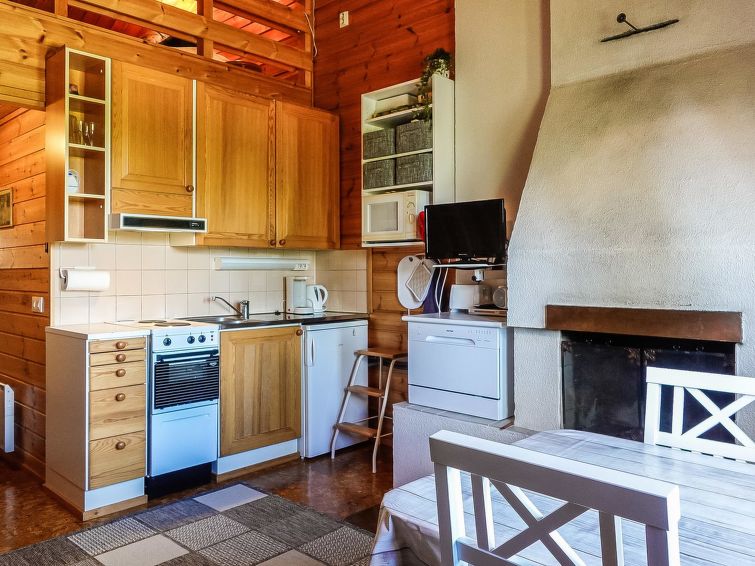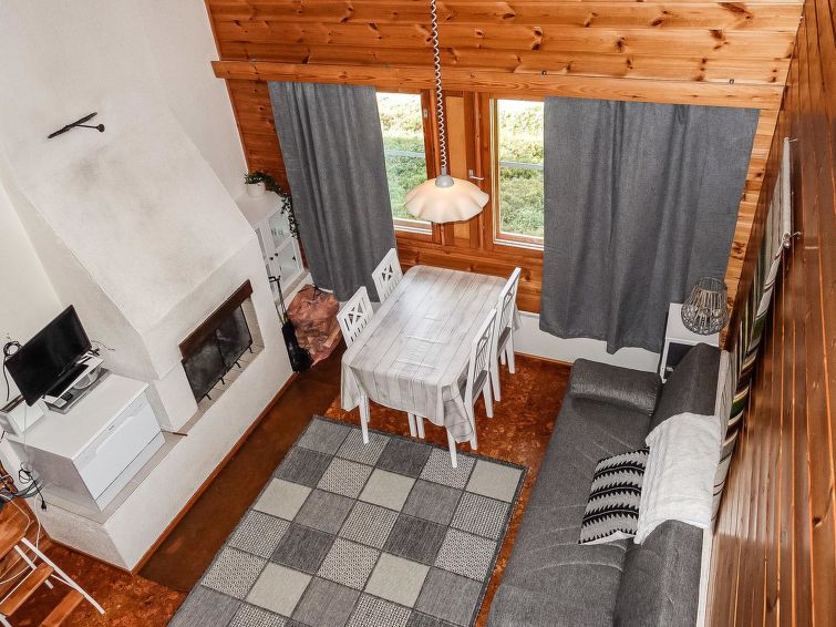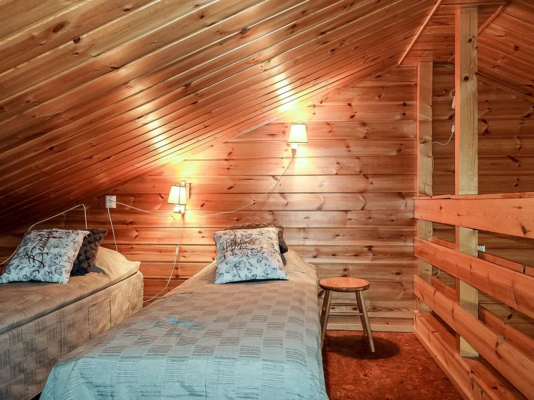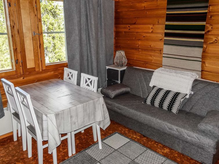 Row house end apartment (made of logs, inside paneled), built in 1985. In the kitchen-living room sofa bed, loft with three single beds (steep stairs to loft, maximum height of 2 m, sloping ceiling), sauna and shower room/toilet. Small dishwasher for few dishes. Iso-Syöte ski slopes 4.5 km. Syöte National Park Information Centre 6 km.