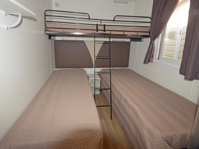 "Maestrale", 3 rom bungalow 32 m2. Praktiskt møbler: stue/soverom med, 1 sovesoffa (70 cm, lengde 185 cm), spisebord. Utgang til verandraen. 1 rom med, 1 dobbeltseng (160 cm), separat WC. 1 rom med 2 senger (70 cm lengde 185 cm), 1 x 1 køysenger. Lite, åpent kjøkken (4 gassbrennere, mikrobølgeovn, frys). Dusj/WC. Oppvarming, airconditioning. Liten terrasse dekt. Terrassemøbler. Fasiliteter: myggnett, høy barnestol barneseng (ekstra). Eiendommen tilhører en type eiendom eller leilighet.
