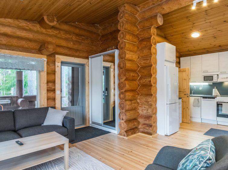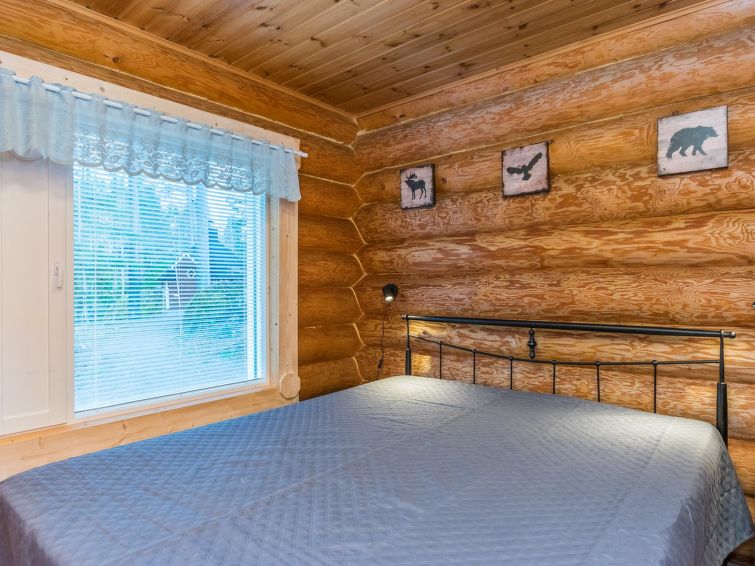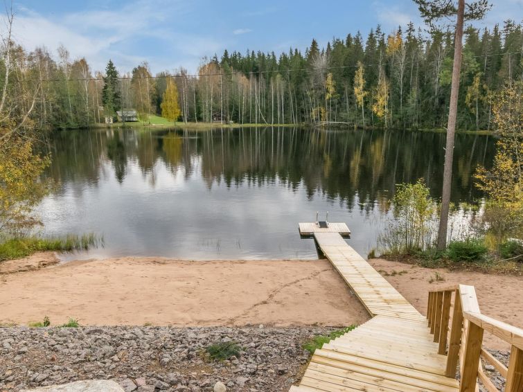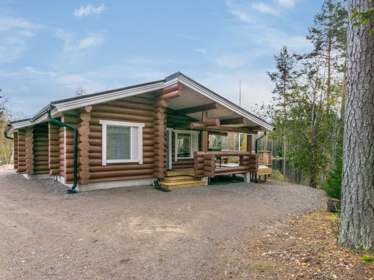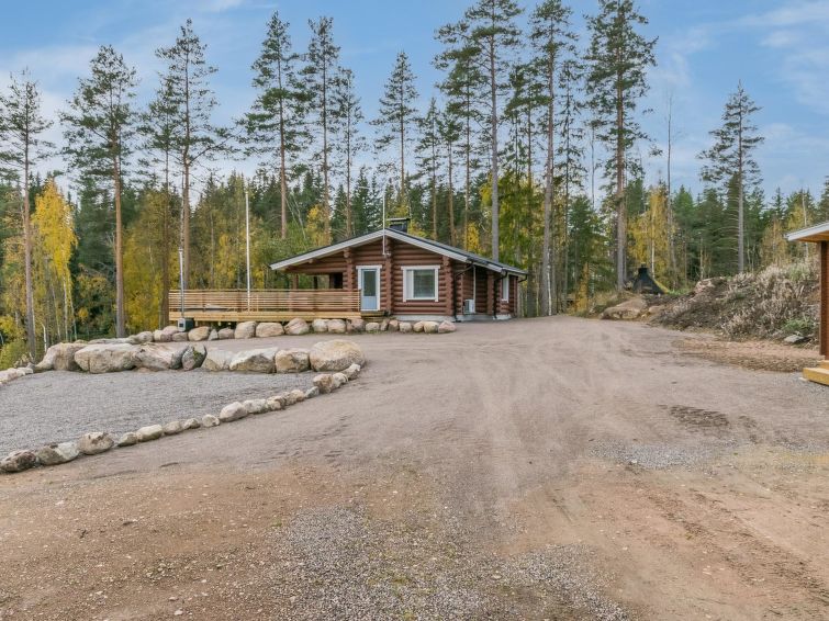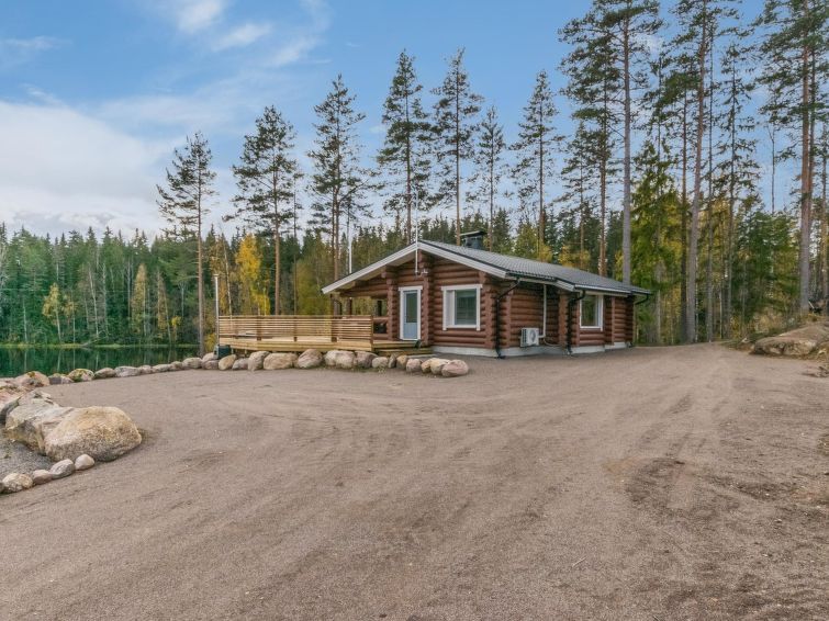 25 km to the east from Kouvola, Väliväylä Canoeing Route 15 m, gently deepening sand beach, rowing boat, and a pier. Round log cabin, built in 1998 and renovated in 2023, features a living room/kitchen, a bedroom with a double bed, another bedroom with a single bed and a bunk bed, a bathroom with a shower and WC, and a wood-burning sauna.