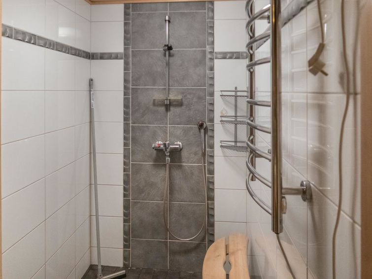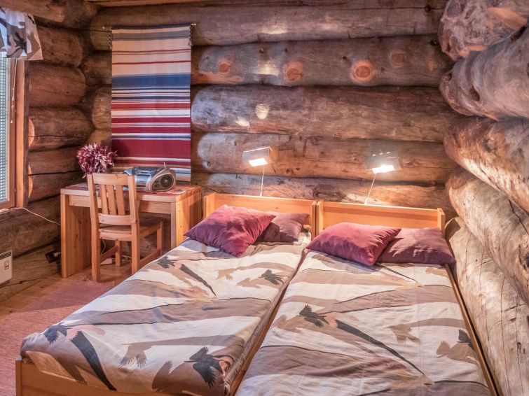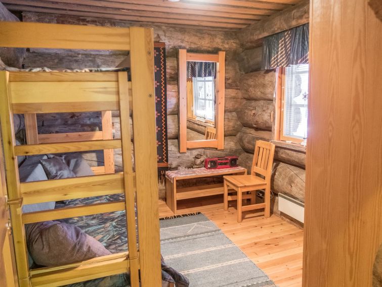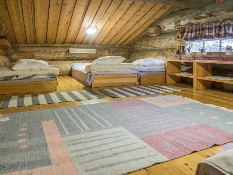 10km north of Kuusamo, Ruka 18km, Lake Oivankijärvi 50m, sandy beach, rowing boat. Log-built semi-detached house with loft, built in 1990, bedroom 1: 2 beds, bedroom 2: double bed, bedroom 3: bunk bed with spread out lowerbed, loft (19 m², low room height, steep stairs): 4 mattresses (in frames 1+1+2), living room, kitchen, electric sauna. Drying cupboard for clothes shared with another appartment in outdoor space. Entrance from veranda.