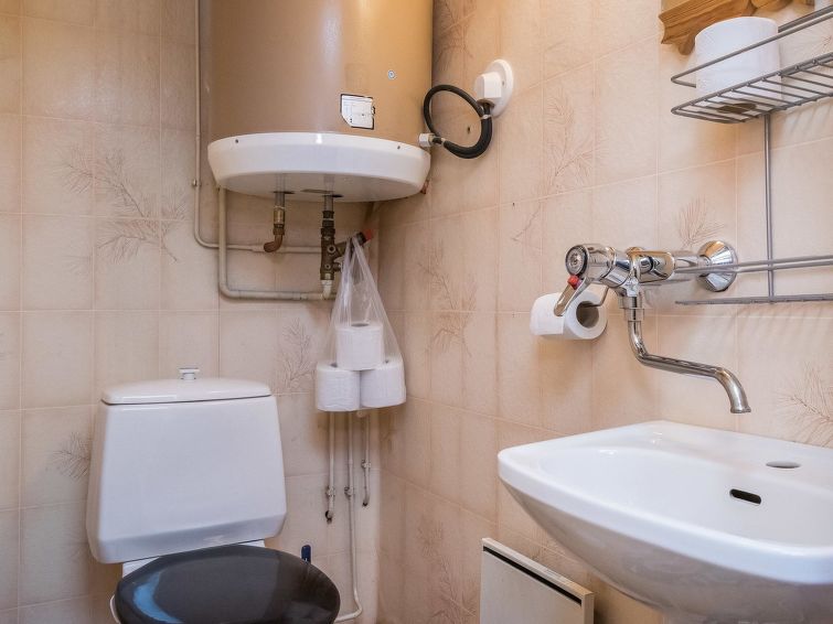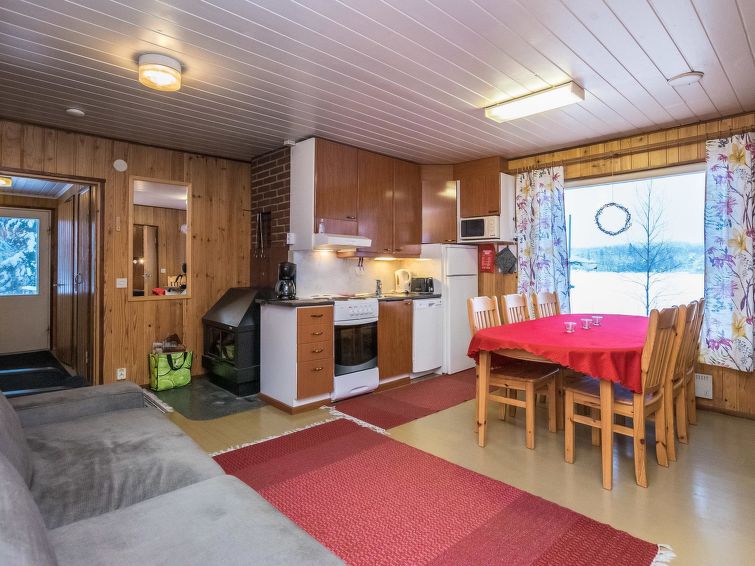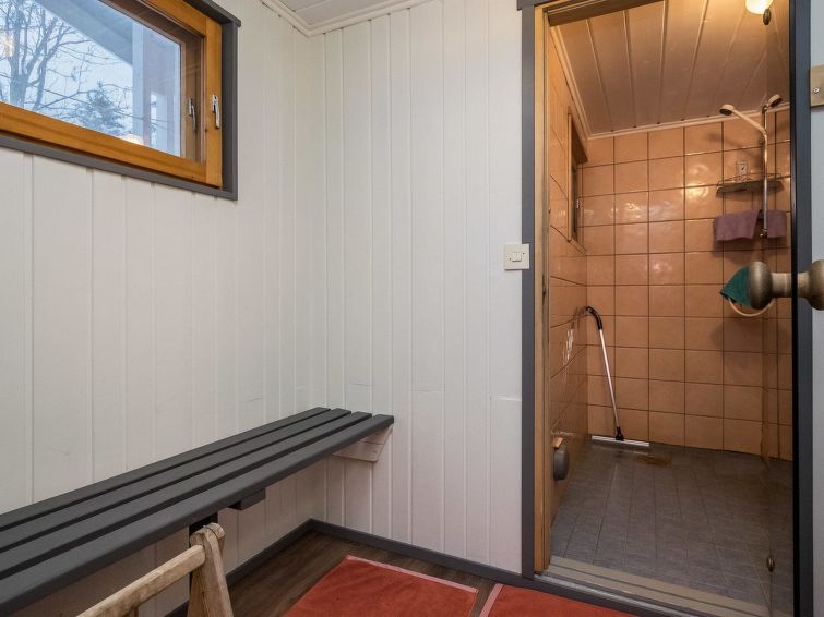 Wooden cabin 1987, renovatad 2008, living room/kitchen with 2 extra beds, 2 bedrooms with 2 beds in each, sauna, dressing room, foyer, open veranda. Outside power point for the car. One pet allowed, extra charge for other pets 10€/pet/week. Bed and high chair for a baby if needed.