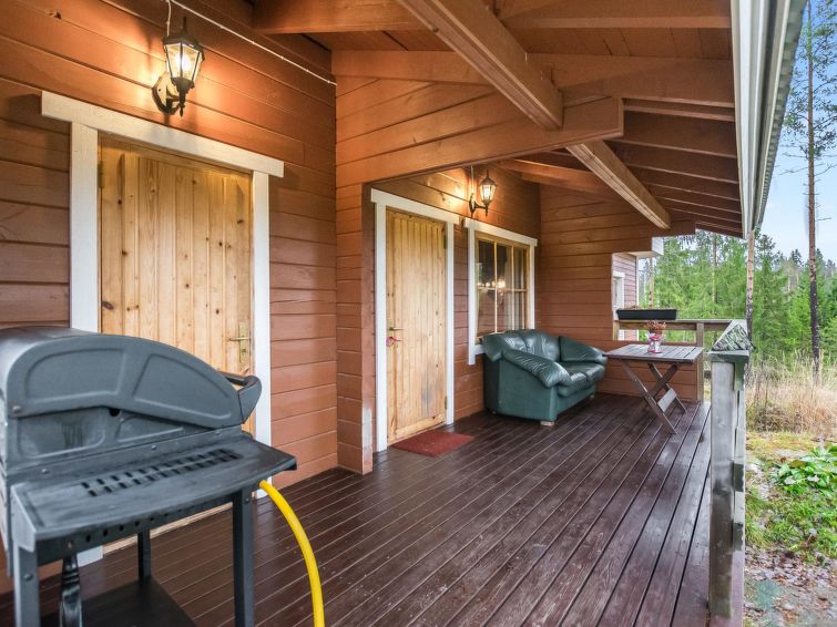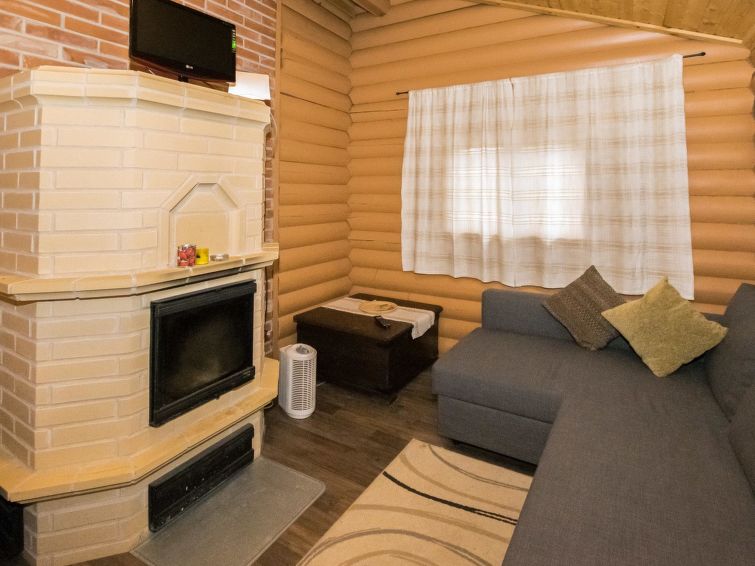 Log cottage 2012, expanded 2014, kitchen (fireplace), living room with 2 beds (exit to back terrace). Through the front terrace to the washroom (where hydro-massage shower and wc). Air source heat pump ( heating and cooling). Gas grill.