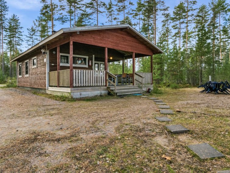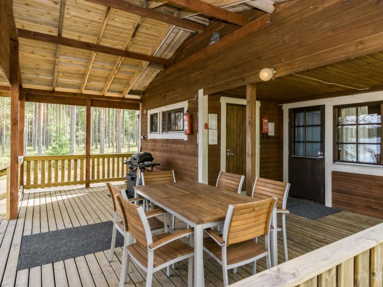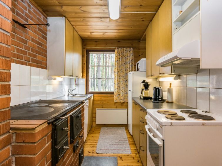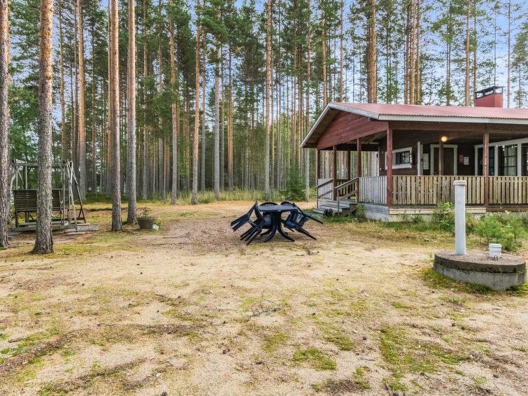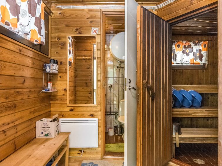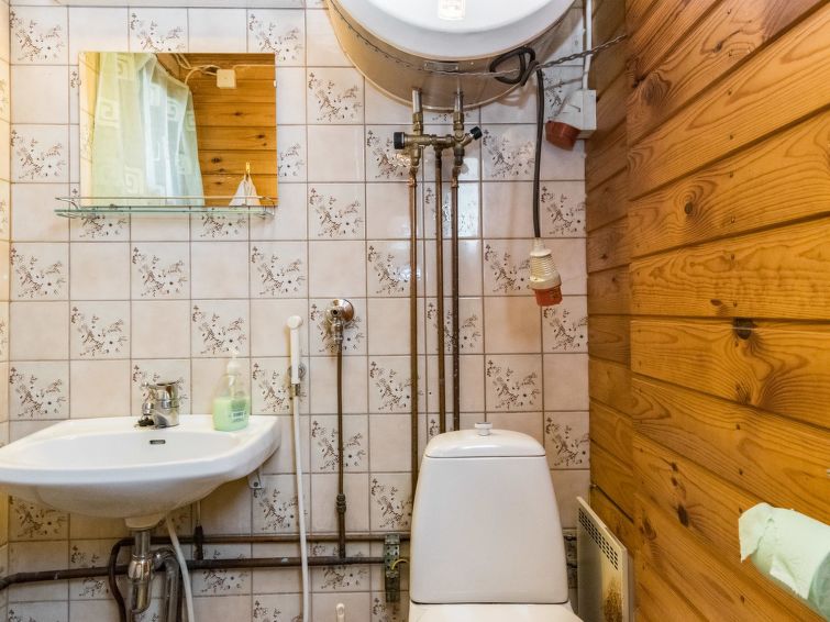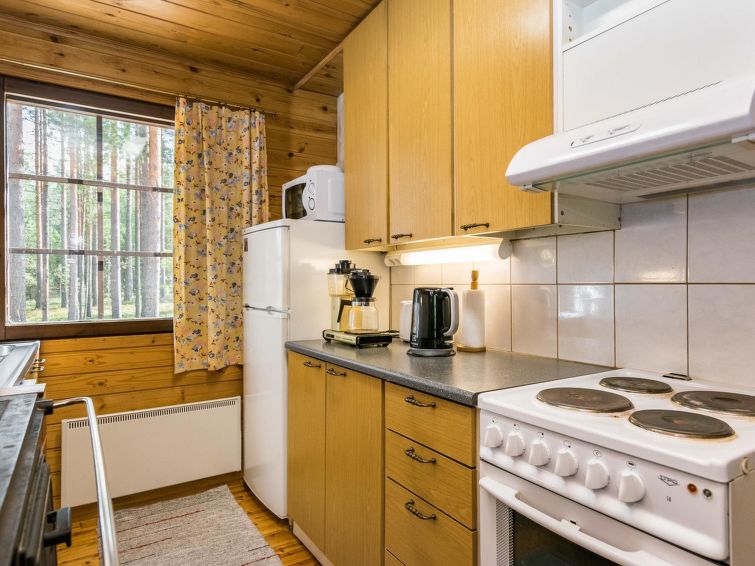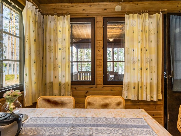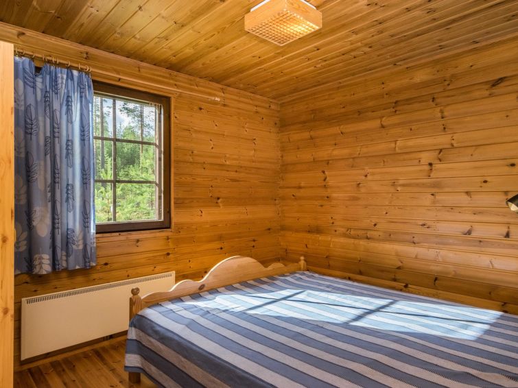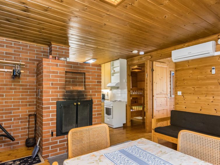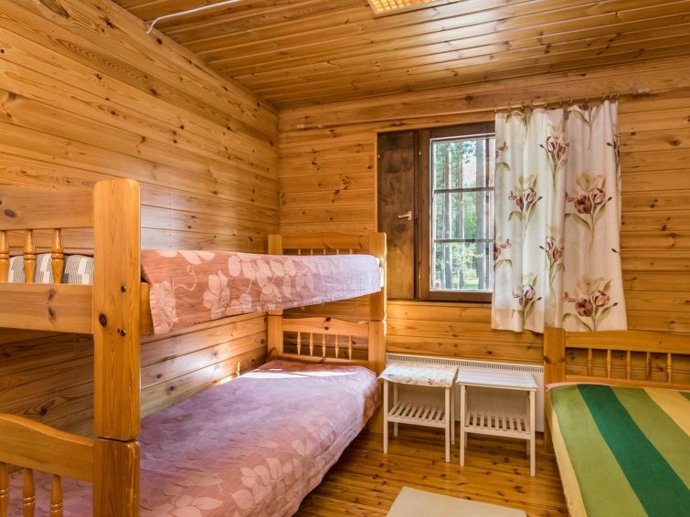 Wooden cabin 1988, kitchenette, living room with 1 extra bed, bedroom with double bed, bedroom with bunk bed and 1 bed, dressing room, toilet, sauna, roofed terrace. Access to WC and sauna from outside. Shower is in sauna. Air source heat pump. Outside power point for the car. Possibility for rapid fishing 1 km.