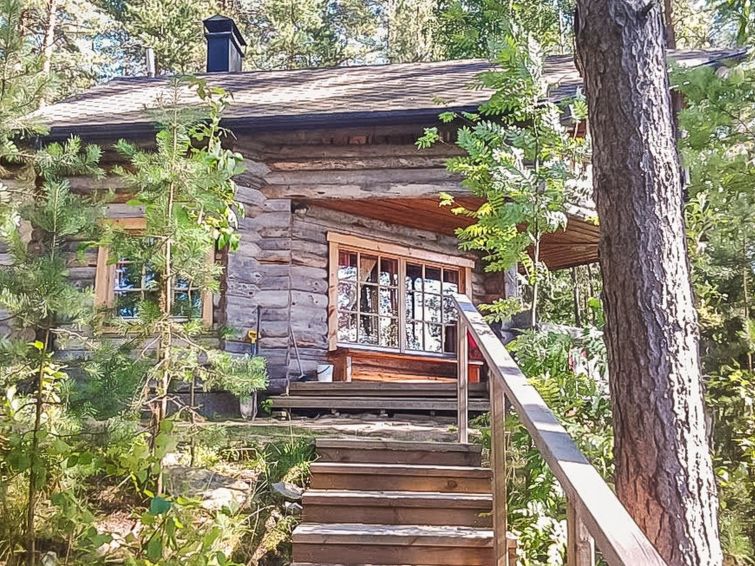 55 km South-West of Joensuu, Orivesi / Saimaa 15 m (536 km²). Rääkkylä 10 km. 80 meters of own shoreline. Shallow sandy bottom. Own rowing boat, kayak, canoe and jetty. The cottage stands on a slope and there are long steps leading down to the beach.
