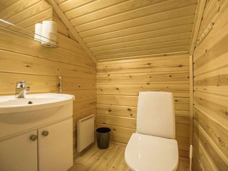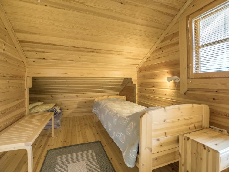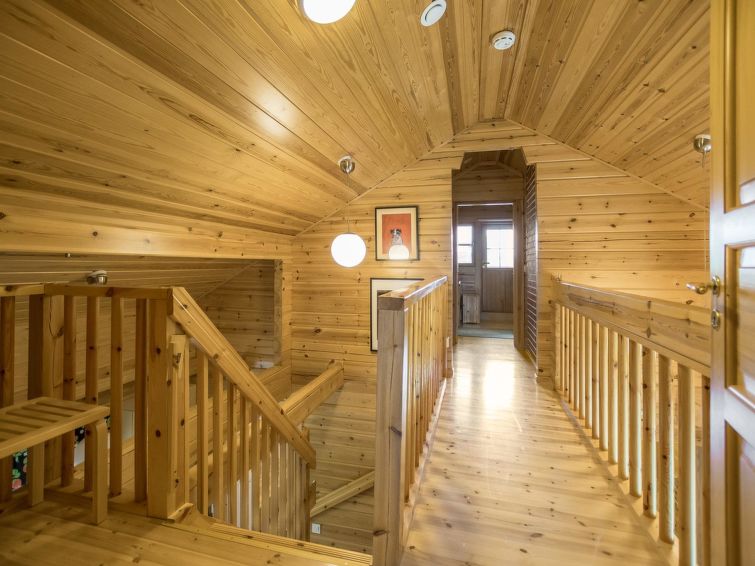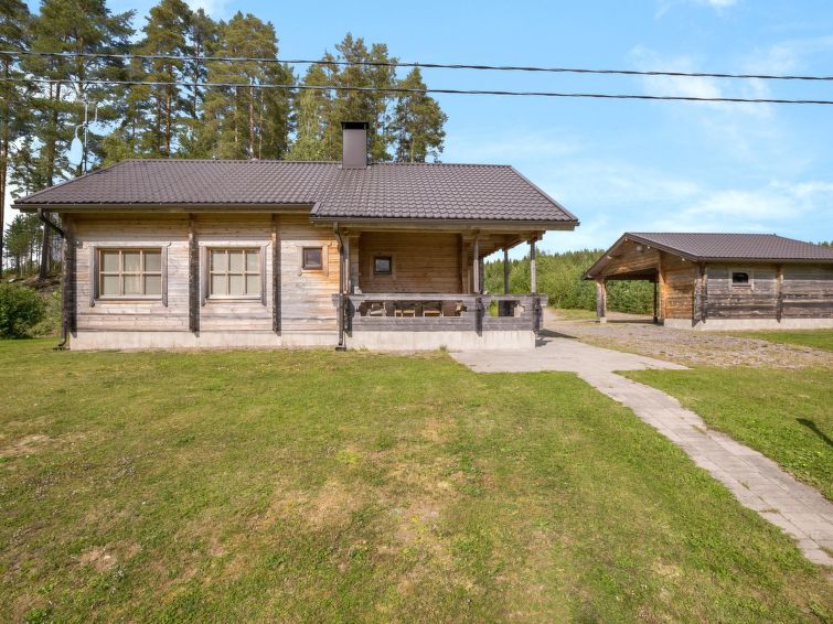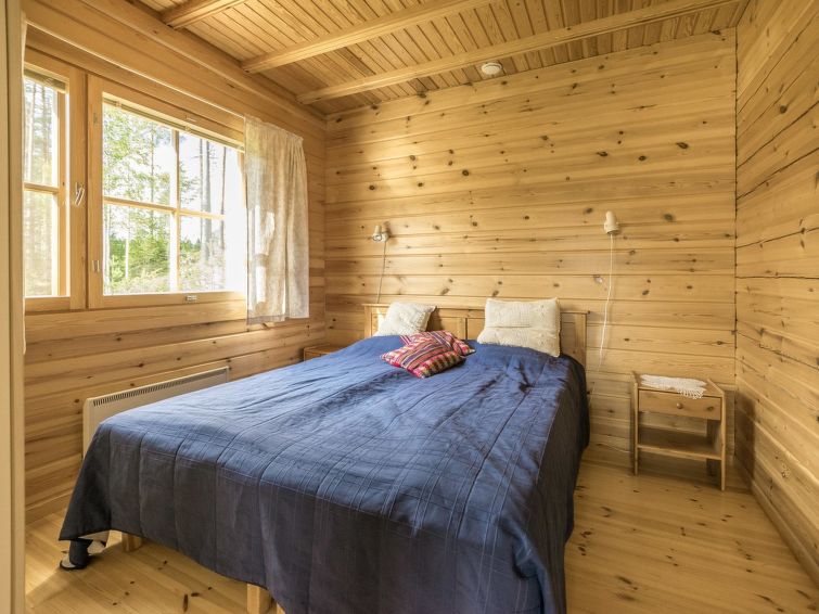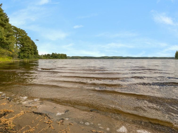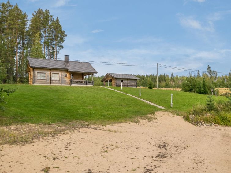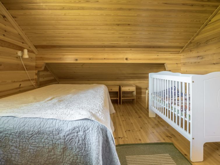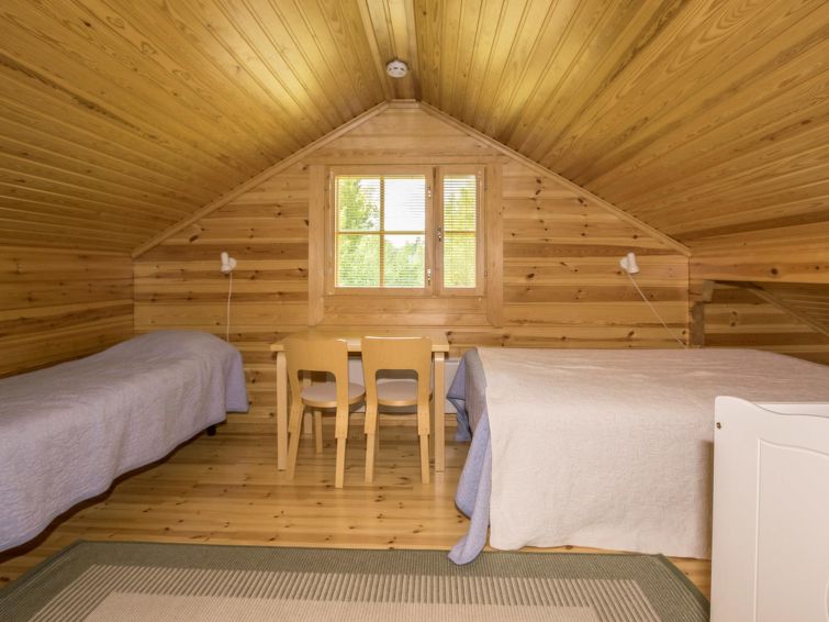 87 km north-west of Jyväskylä, L.Kalmarinselkä 30 m (Length 6 km and width 1.7 km), shallow, hard moraine bottom, own boat. Log cottage 2007, downstairs: living room/kitchen extra double bed, bedroom double bed, dressing room, washroom, sauna, porch. Upstairs: 2 bedrooms both with 2 beds, hall, balcony. On sloping grassy plot in lovely situation. In yard log car port/storeroom/wood shed.
