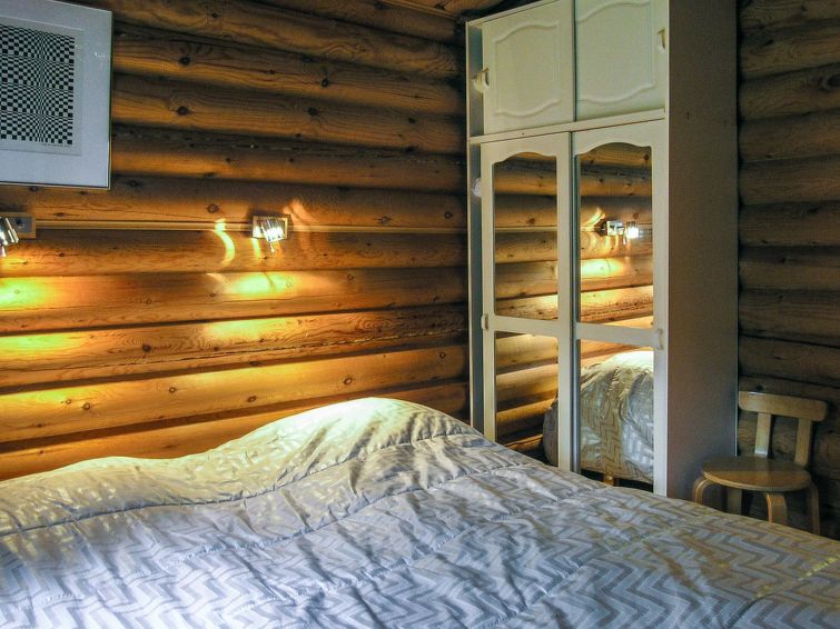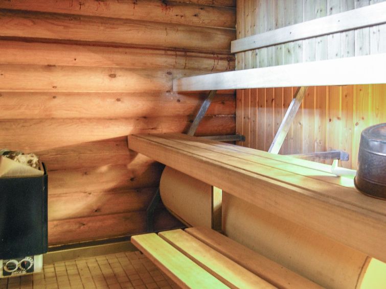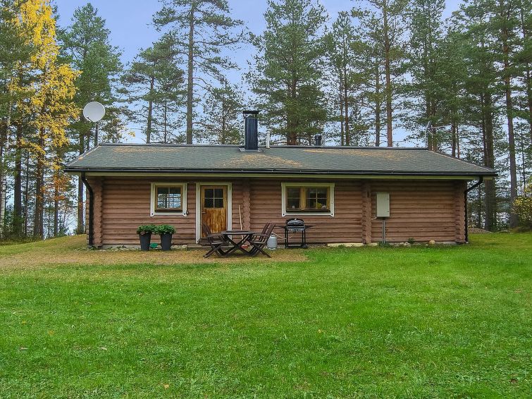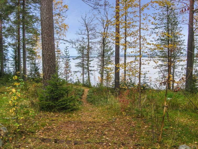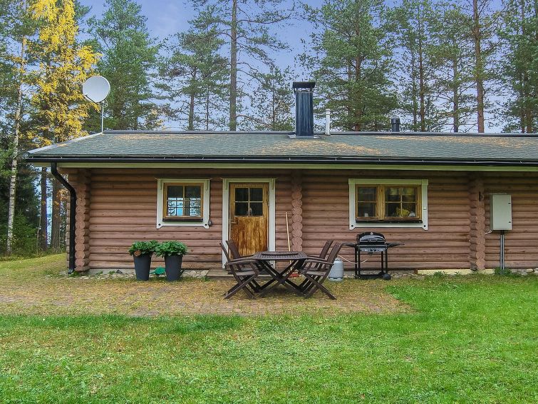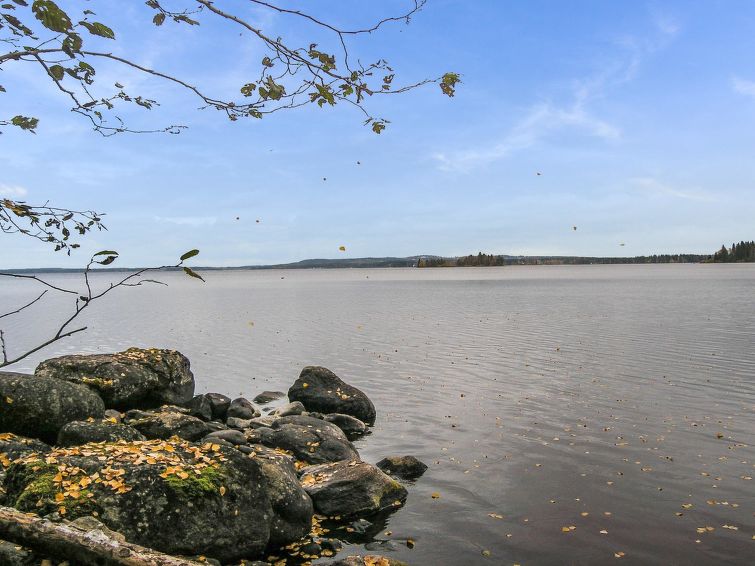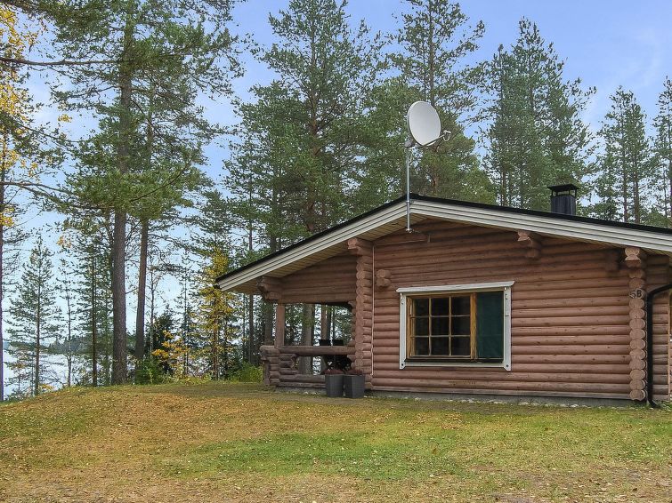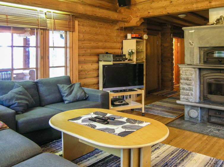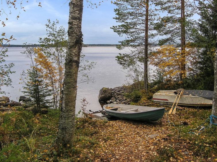 Cottage living area 78 m², kitchen, livingroom, fireplace with baking oven, bedroom with double bed, bedroom with separate beds for two, shallow sleeping loft with 2 mattresses (steep steps to loft). Extra bed also in sofa (for 1-2 persons). Note: bed places max for 6 persons! Toilet, washroom/shower, dressing room, sauna (elec. stove), terrace. Neat cottage on shore of large waterway, opposite shore 5 km. Peaceful location, plot with large grassy area, shore boundary in a natural state. Vuokatti 3.5 km and Spa Katinkulta by boat 2 km, by road 6 km. Boat and outboard motor (2.5 hp) included in price. Nuasjärvi is well stocked with fish. Neighbouring cottage is 8104.