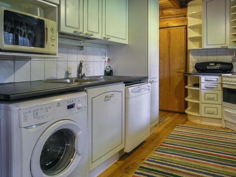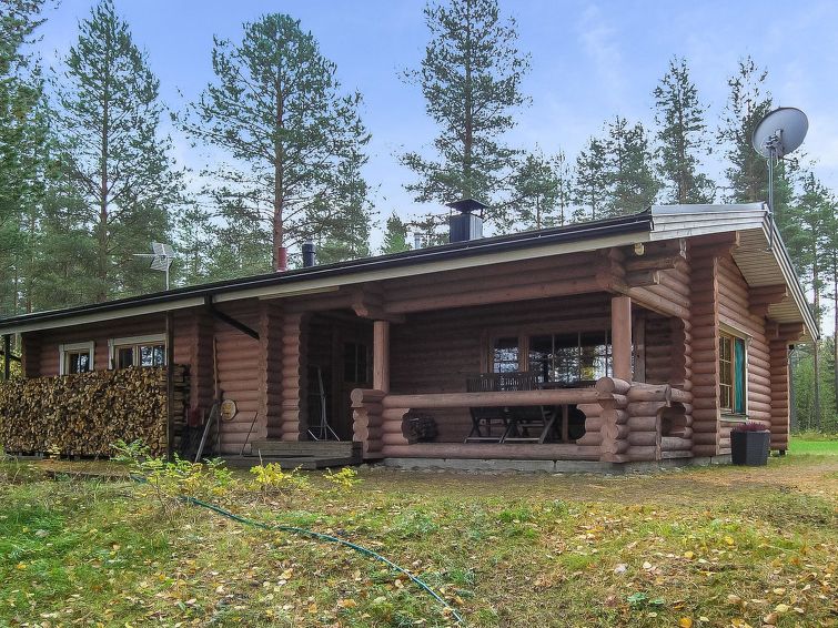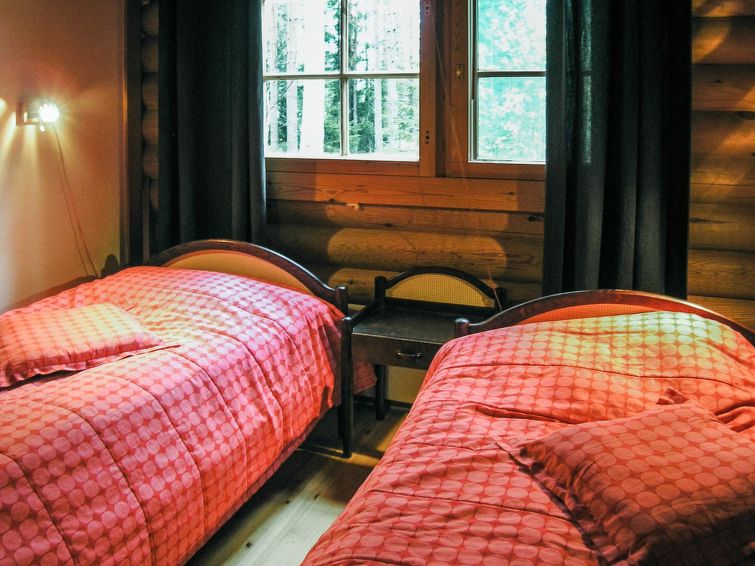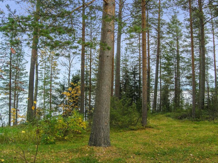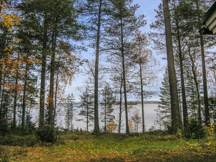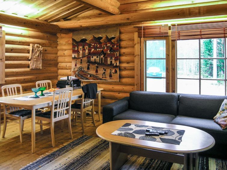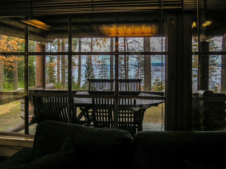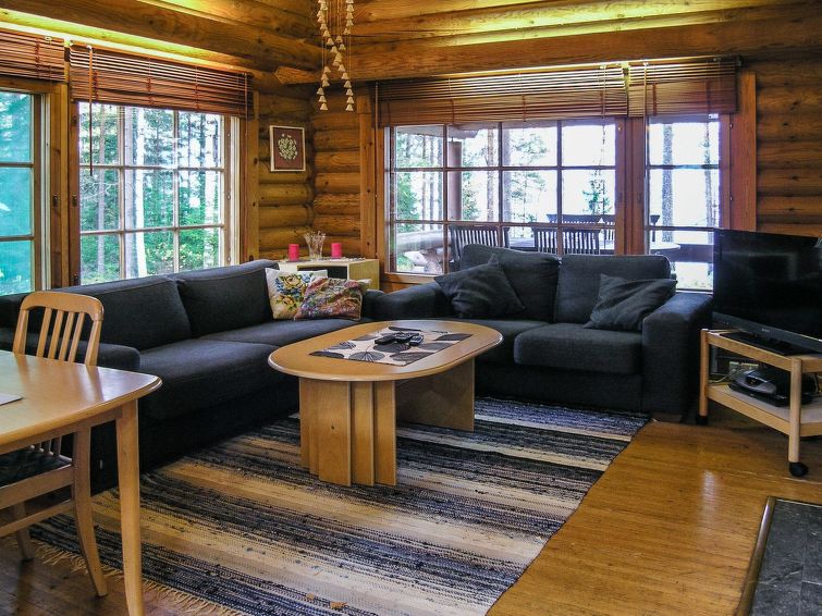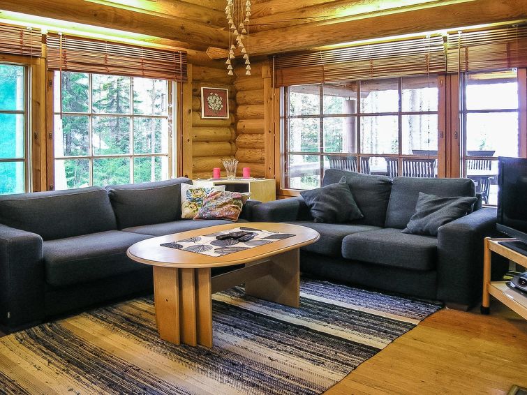 Cottage living area 78 m², kitchen, livingroom, fireplace with baking oven, bedroom with double bed, bedroom with separate beds for two, shallow sleeping loft with 2 mattresses (steep steps to loft). Extra bed also in sofa (for 1-2 persons). Note: bed places max for 6 persons! Toilet, washroom/shower, dressing room, sauna (elec. stove), terrace. Neat cottage on shore of large waterway, opposite shore 5 km. Peaceful location, plot with large grassy area, shore boundary in a natural state. Vuokatti 3.5 km and Spa Katinkulta by boat 2 km, by road 6 km. Boat and outboard motor (2.5 hp) included in price. Nuasjärvi is well stocked with fish. Neighbouring cottage is 8104.