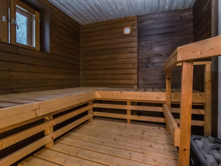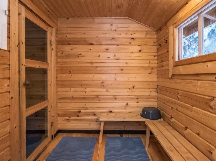 Downstairs: bedroom with two beds, dressing room, washroom, sauna, toilet, hallway, open porch.