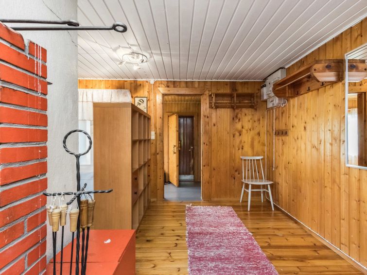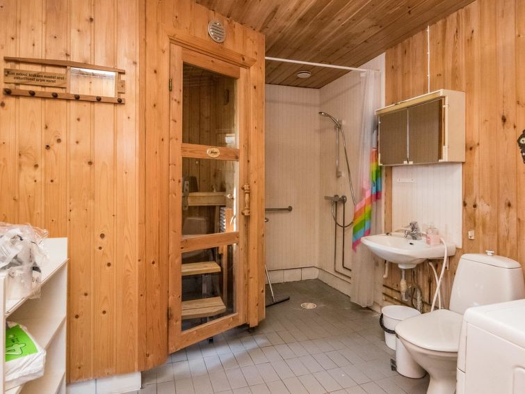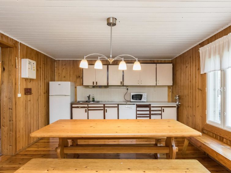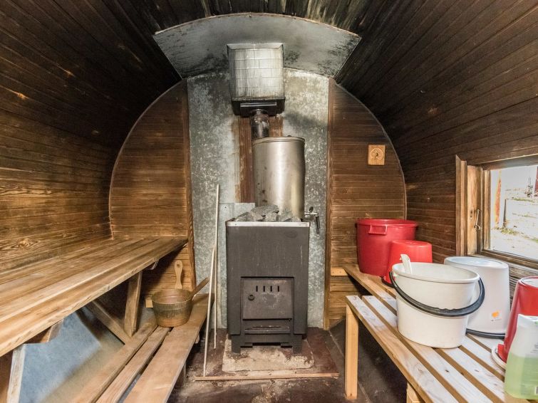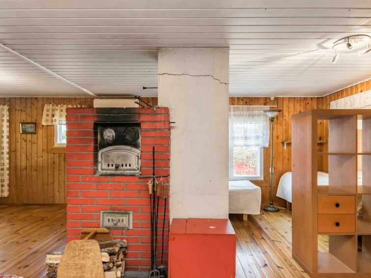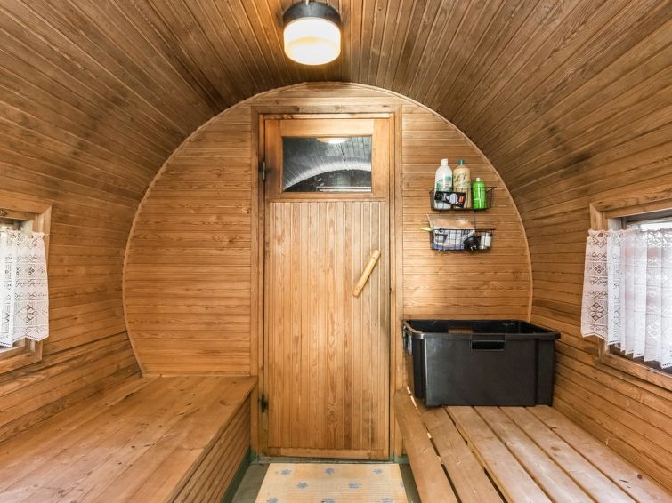 Wooden cabin 1985, renovated 1993, kitchen, living room with sofa bed for two, living room with curtains separated sleeping alcove (two beds), double bed in the bedroom (12 m²), outbuilding (available in winter) with bunk bed and spreadable bed for two, washroom with shower and WC, electric sauna stove in the sauna. Air source heat pump, Wi-Fi.