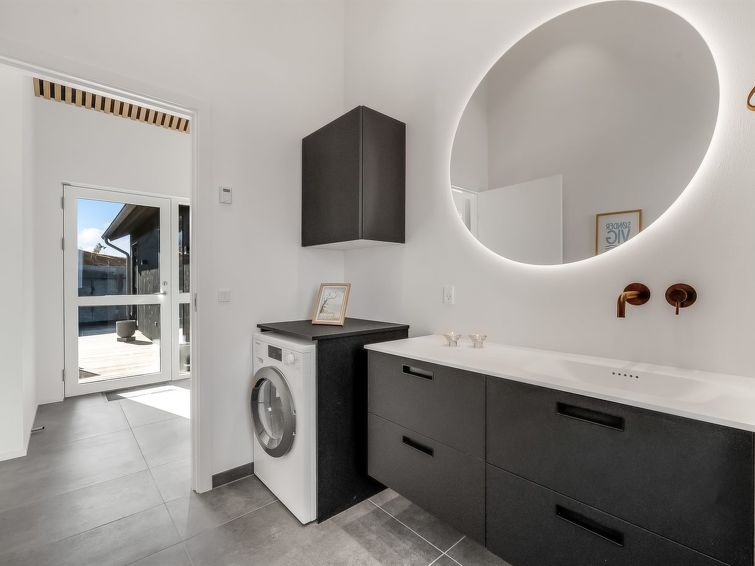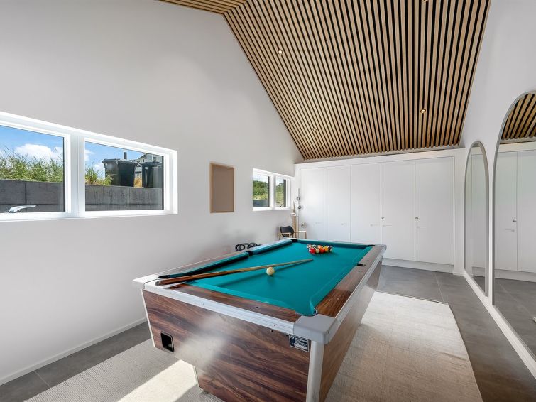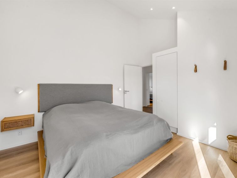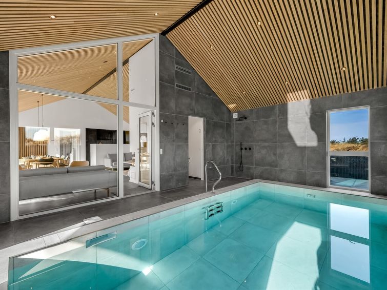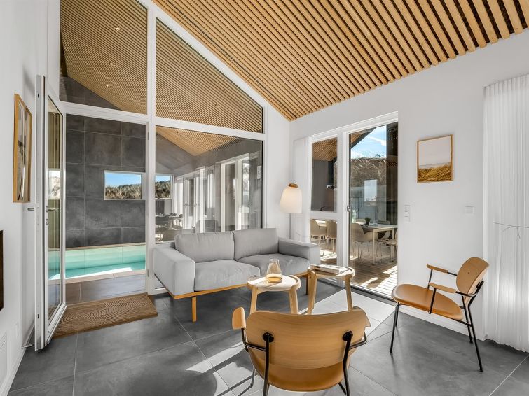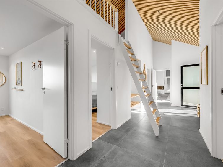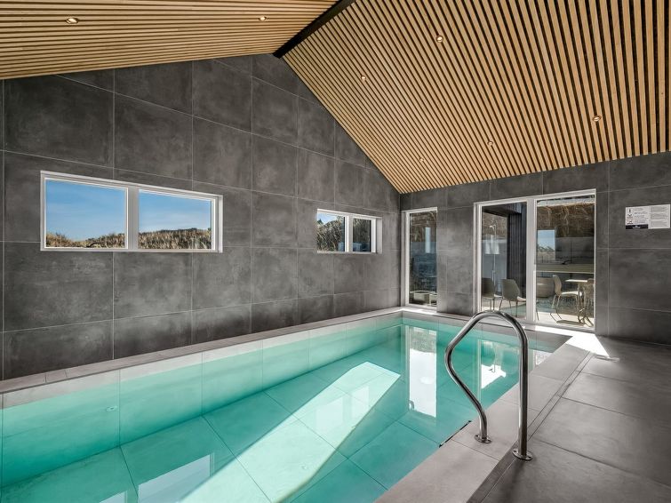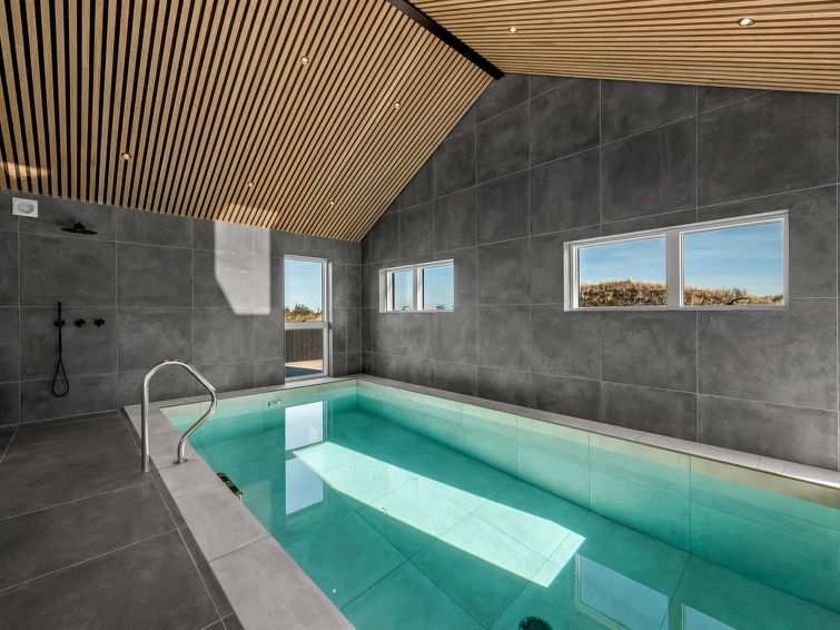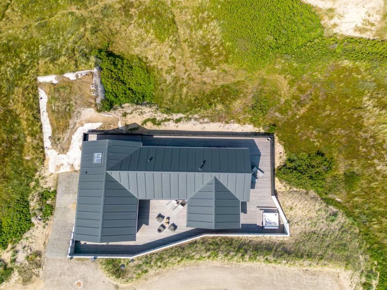 Enmannsbolig, bygget i 2023. 250 m fra sjøen. Privat: uberørt tomt 1'200 m2, innendørs pool. Utendørs dusj, terrasse (135 m2). I huset: vaskemaskin, tørketrommel. Parkering ved hbrukt. El-ladestasjon. Daglivarehandel 100 m. Golfbane 1 km. Eieren godtar ikke noen ungdomsgrupper.