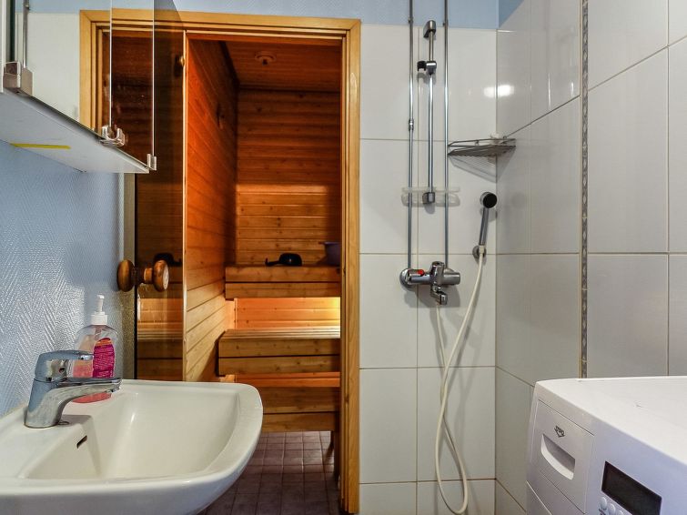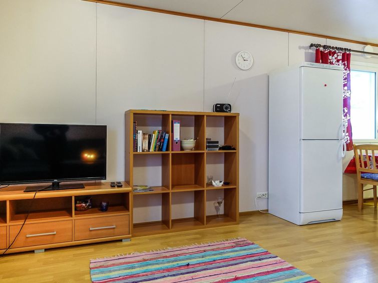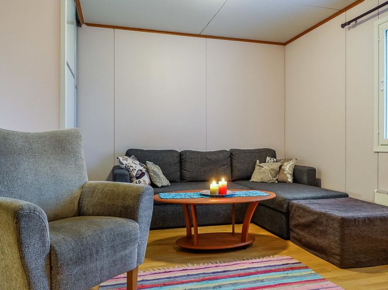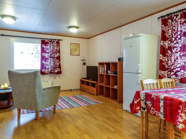 385 km north of Rovaniemi, Lake Inarijärvi/Partakonlahti bay 10 m, shallow, hard sand bottom, own small rowing boat (5 m long). Wooden cottage 1980, renovated 2008, living room/kitchen convertible sofa/bed (width 140 cm), bedroom 2 beds, sauna (electric stove), washroom. Renovated cottage on Lake Inarijärvi shore in small inlet with fine sand beach. Sunny location, open lake scenery towards Lake Inarinjärvi. On shore a camp fire site. Other neighbor house on the same yard.