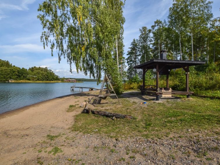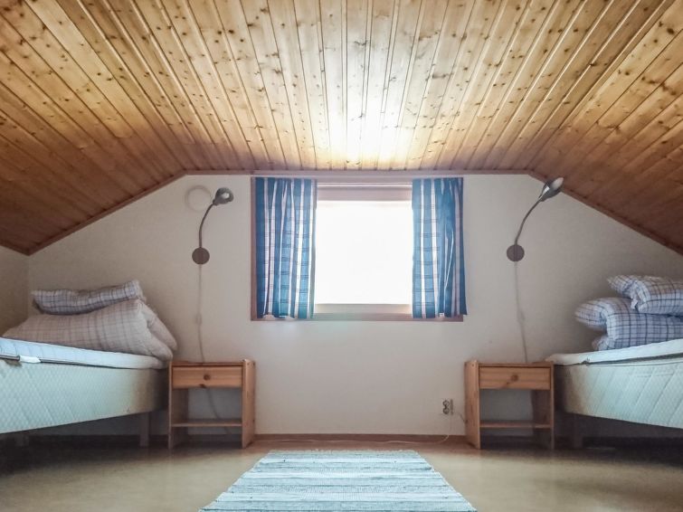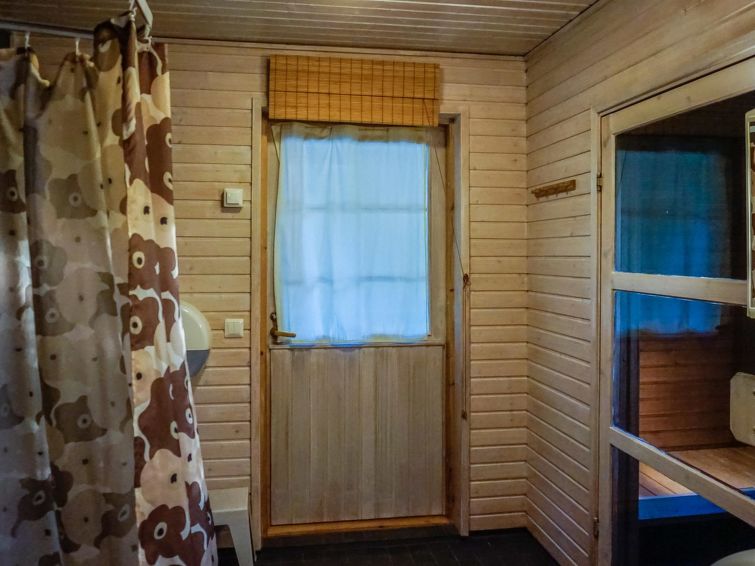 40 km south of Turku, Turunmaa Archipelago sea/Airisto 60 m, shared shore with deep shore, hard sand bottom, own boat. Wooden cottage 2006, living room/kitchen, 2 bedrooms 2 beds in each, sleeping loft 2 beds (steep stairs to loft ), washroom, WC, sauna (electric stove ), open porch. Cottage has WC for disabled, doors are 90 cm wide, and porch has ramp. Cottage located in village with 6 other cottages (8031-8037). Cottages share shore and 2 jetties. Plots are level, rather steep slope to shore.