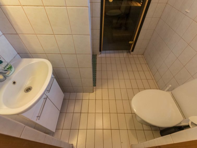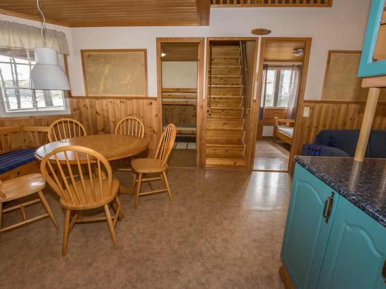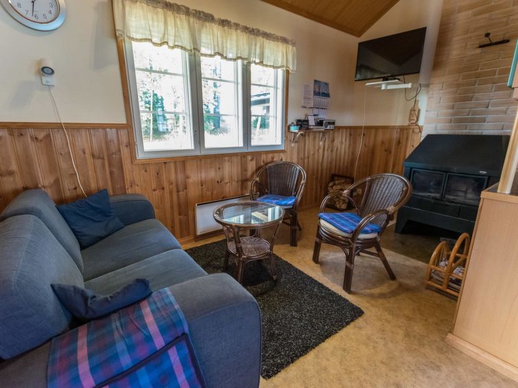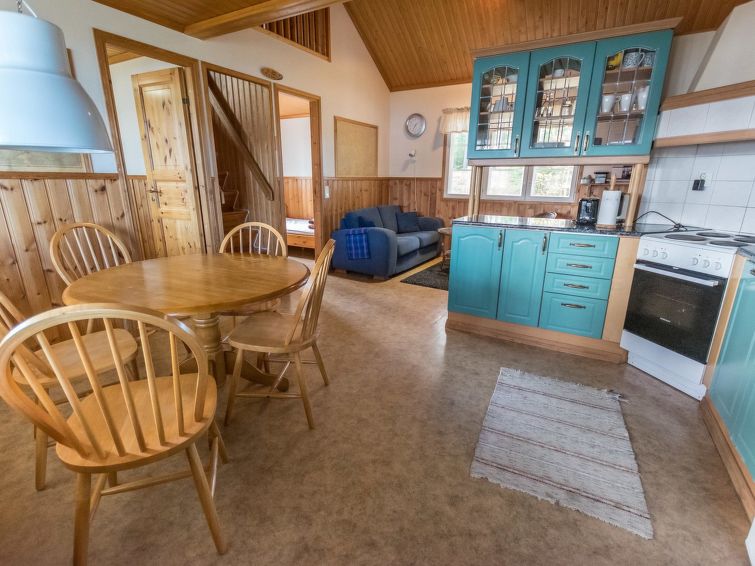 Wooden cabin 1999, living room/kitchen, bedroom with twinbed 120 cm, sleeping alcove with bunk bed, upstairs bedroom 1 bed (120 cm wide), open balcony with twin bed (160 cm).