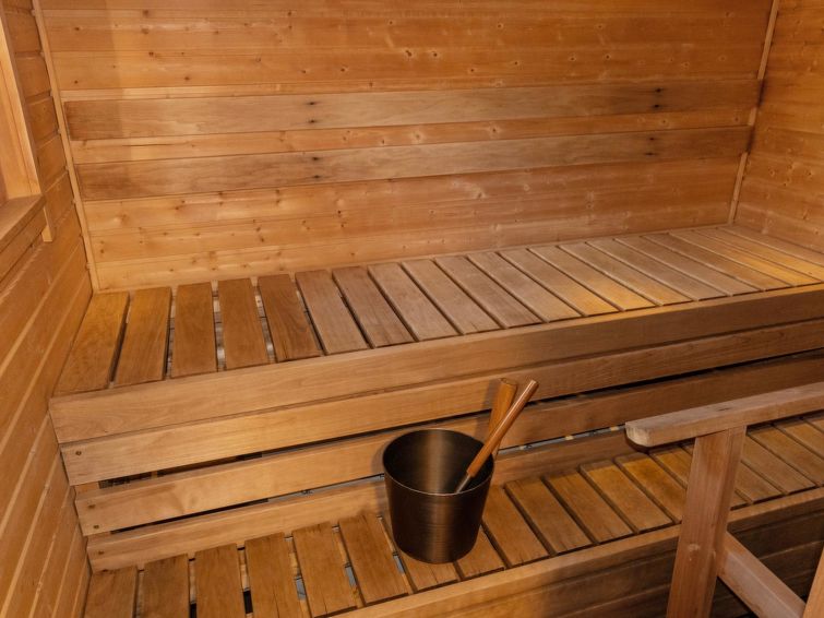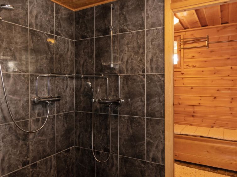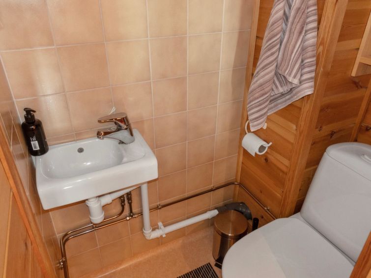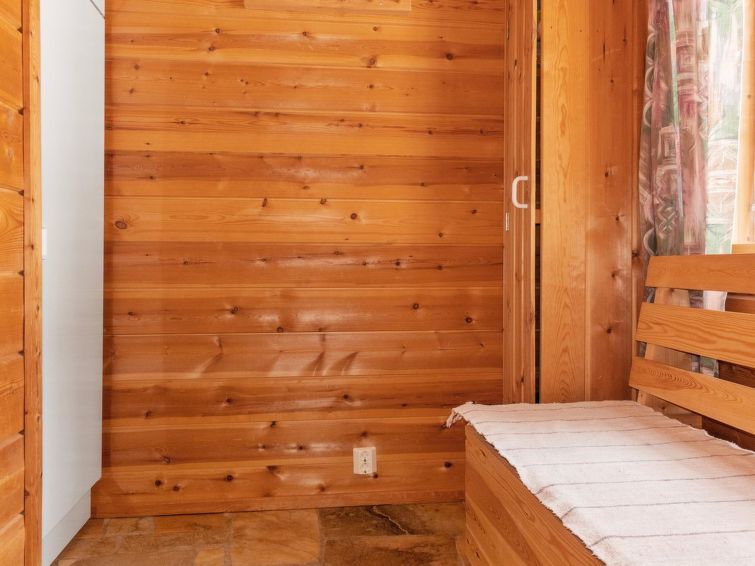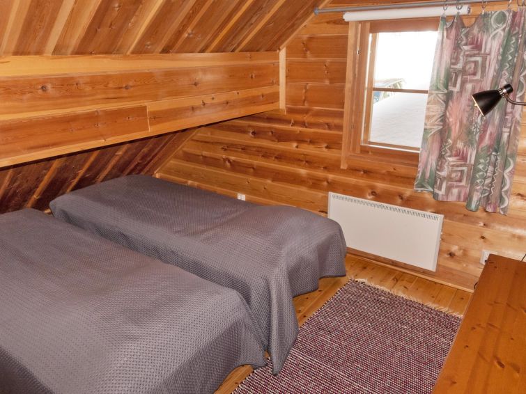 A log cabin 2012, kitchen, bedroom with double bed, sauna (electric stove), bathroom (2 showers), dressing room, separate toilet, open porch. Upstairs 2 bedrooms with 2 beds, a toilet also in upstairs, balcony. Steep stairs to upstairs.