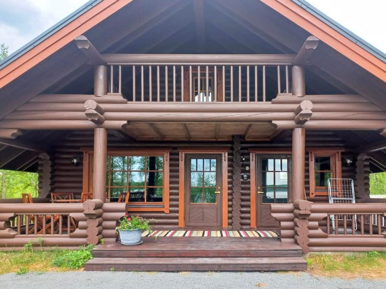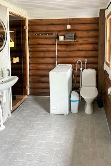 Log cottage 2003, living room/kitchen, bedroom double bed, sleeping loft (30 m²) 4 beds, washroom, sauna (electric stove), open porch and balcony. Separate lakeshore sauna with dressing room, shared with neighbouring cottage 8121. Sauna has manual water pump and hot water container on stove.