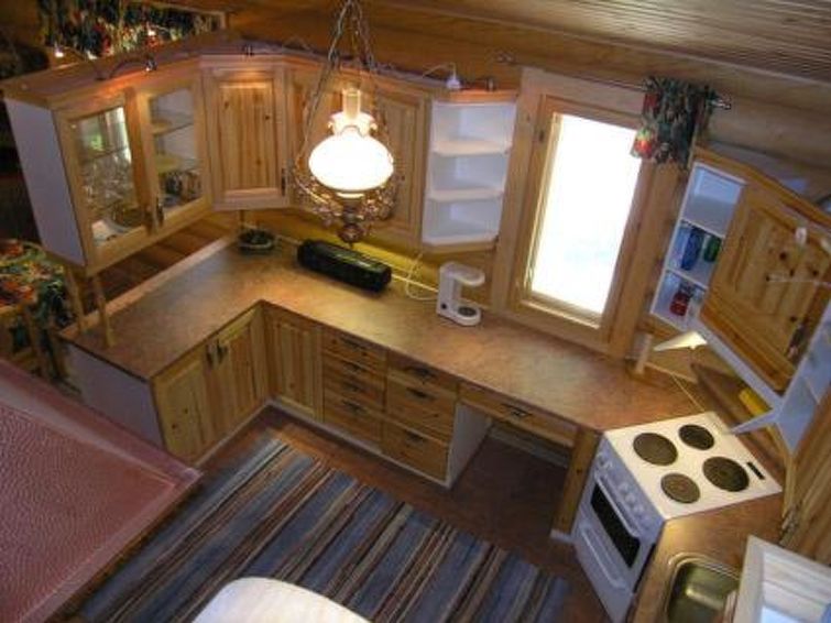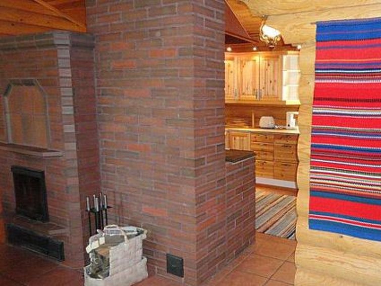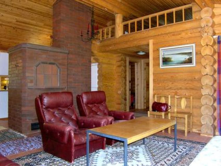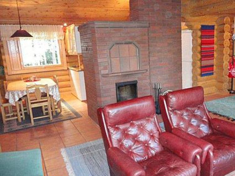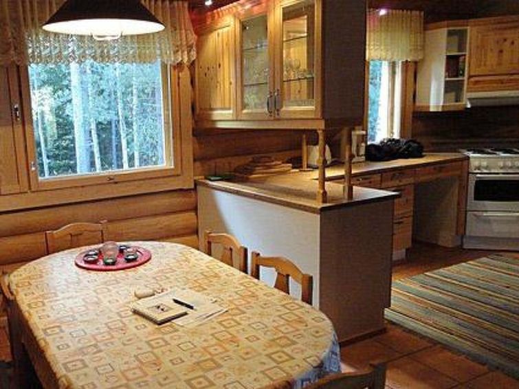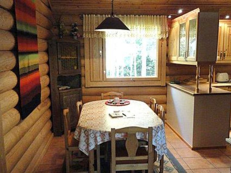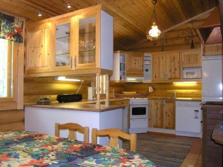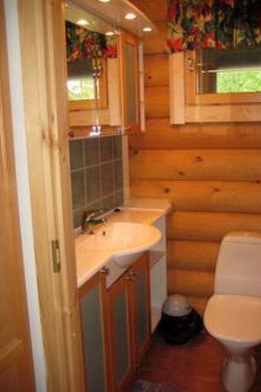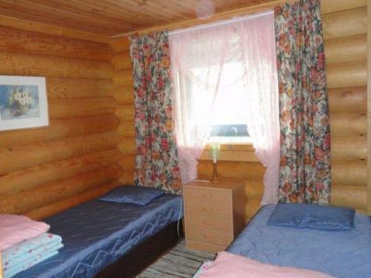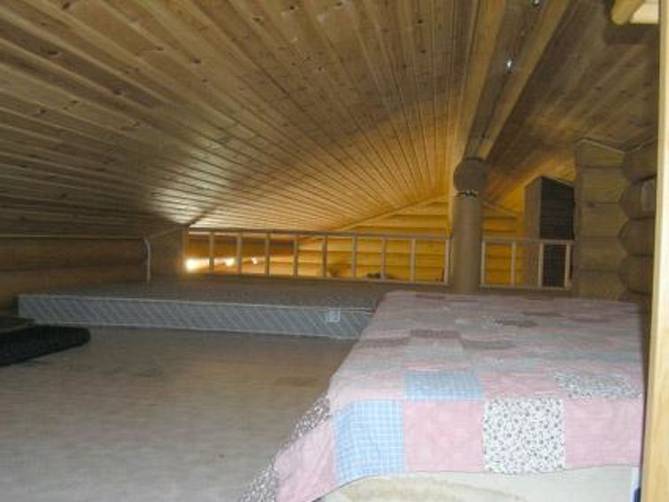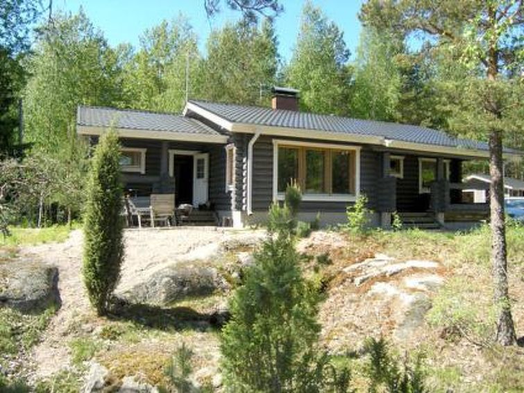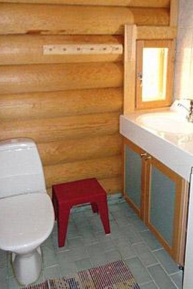 Log chalet 2004, living room/kitchen (wood-burning kitchen stove), living room convertible sofa/bed (heat-storing fireplace and baking oven), bedroom 2 beds, bedroom 2 beds (access to low sleeping loft), shallow sleeping loft with mattresses for 2, sauna (electric stove, washroom 2 showers, dressing room, 2 separate WCs. Building has underfloor heating. Robust roundlog chalet with all normal house conveniences with sleeping loft. Separate garage and woodshed. Yard area level, bright and rocky. Peaceful location. Distance along road to shared shore, which is little used, is 300 m. Quiet village road runs between chalet and shore in a distance of 100 m. Shore also suitable for small children, no jetty.