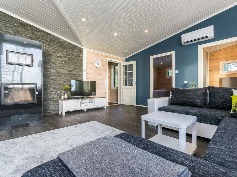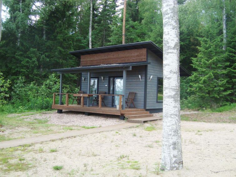 Log cabin 2020, living room/kitchen, two bedrooms, one with double bed (160 x 200 cm Yankee bed), another with 2 80 x 200 cm beds, sofa which can be spread as spare bed (120 x 200 cm) in living room, WC, sauna (wood-fired sauna stove), washroom with two showers, hall, large open terrace with gas grill and garden furniture.