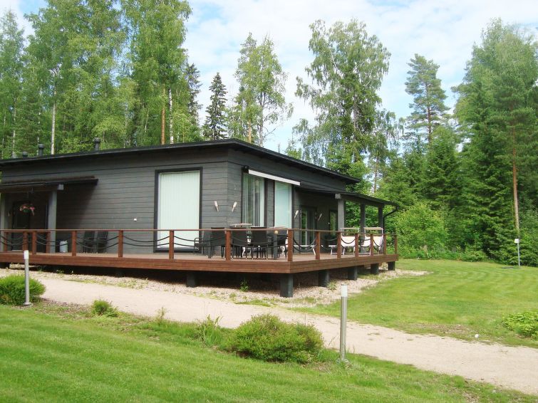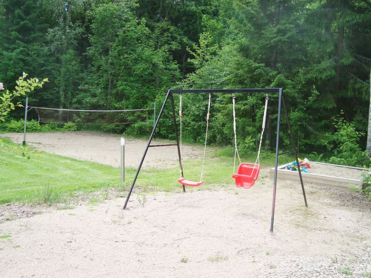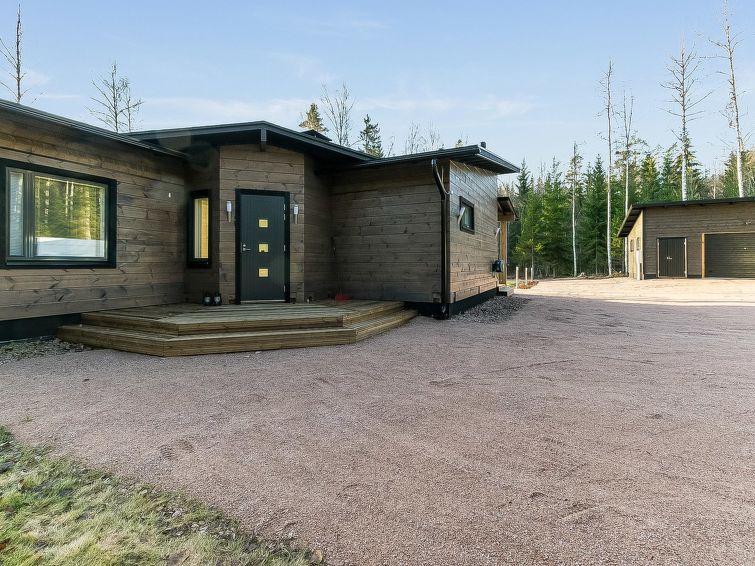 The garage shown in the pictures is locked for storage use. Stylish and cozy cabin on the flat, grassy and sunny plot. Badminton net and children's swings in the yard.