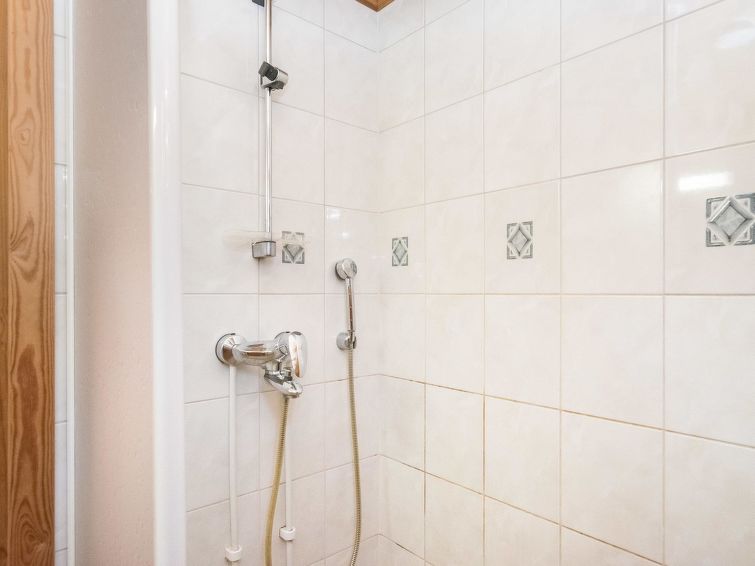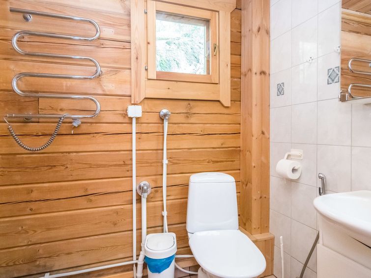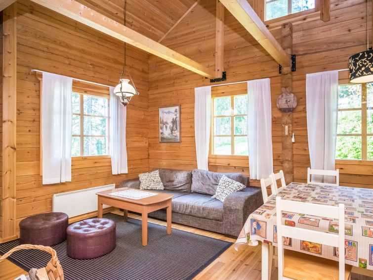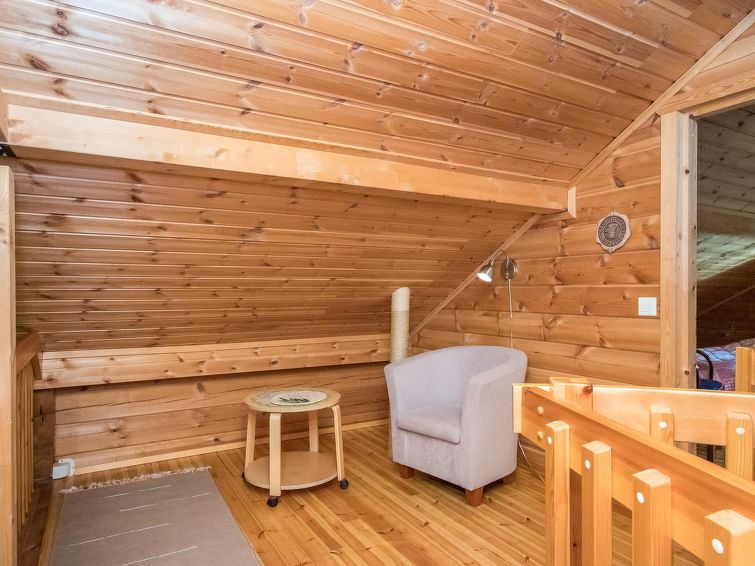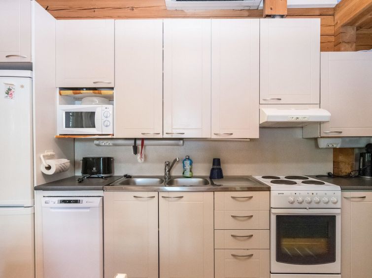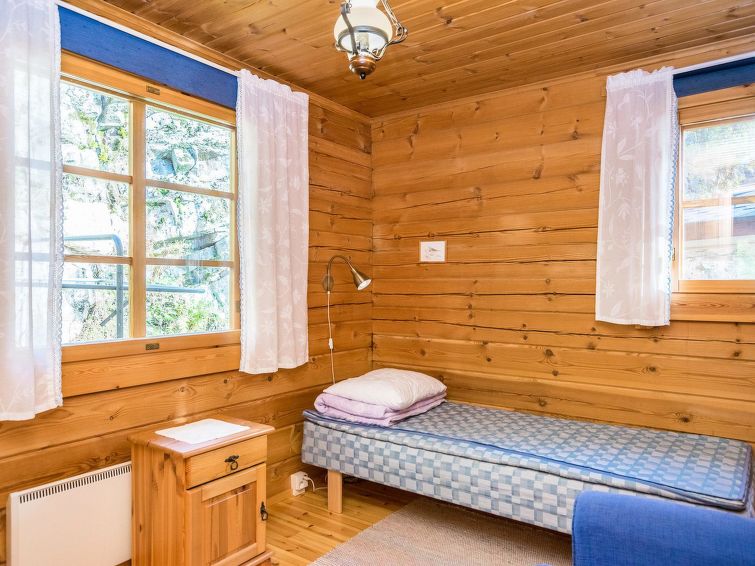 Log cabin 2007, living room kitchen (22 m²), bedroom (10 m²) double bed, bedroom (8 m²) 1 bed and 1 extra armchair bed, washroom with WC and shower, hall.