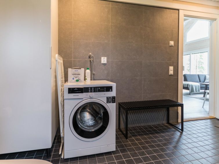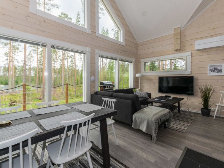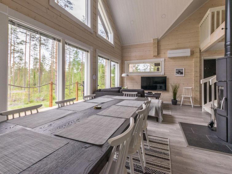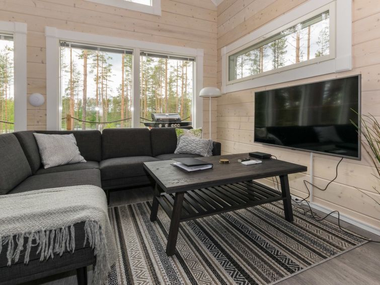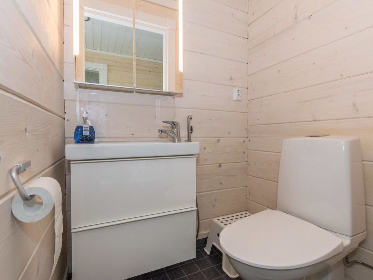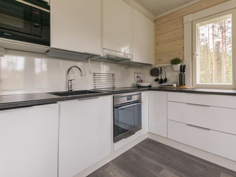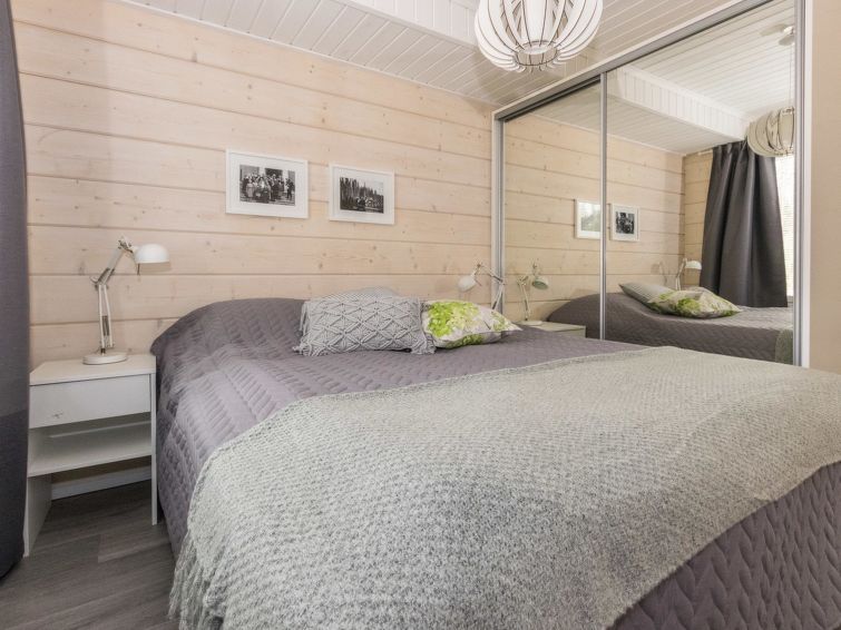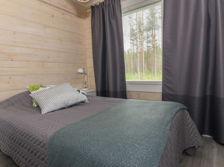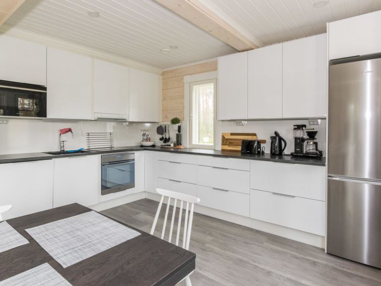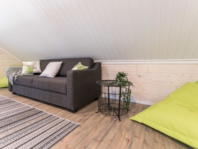 Log cabin 2019, bedroom 1: two 80 x 200 cm beds, bedroom 2: 120 x 200 cm bed, bedroom 3: two 80 x 200 cm beds, bedroom 4: two 80 x 200 cm beds, sofa bed (140 x 190 cm spare bed) in the lobby on the upper floor. Living room with wood-burning stove, dining group which can be extended (for 10 people group), well-equipped kitchen corner, sauna (electric sauna stove), washroom, terrace with gas grill and garden furniture.