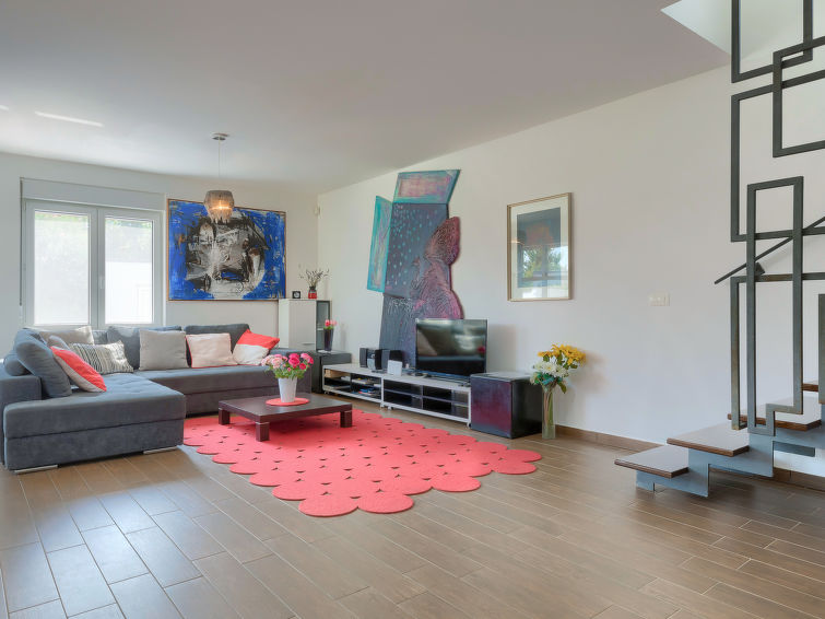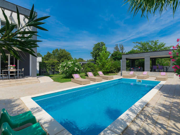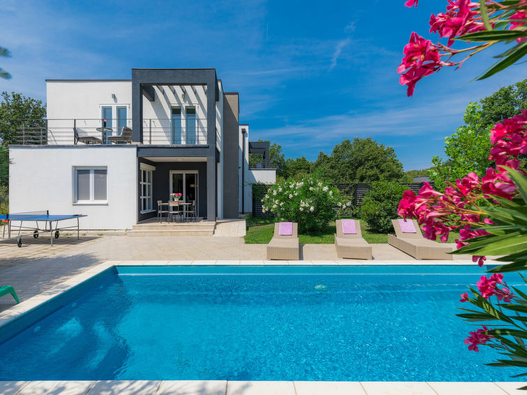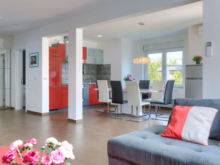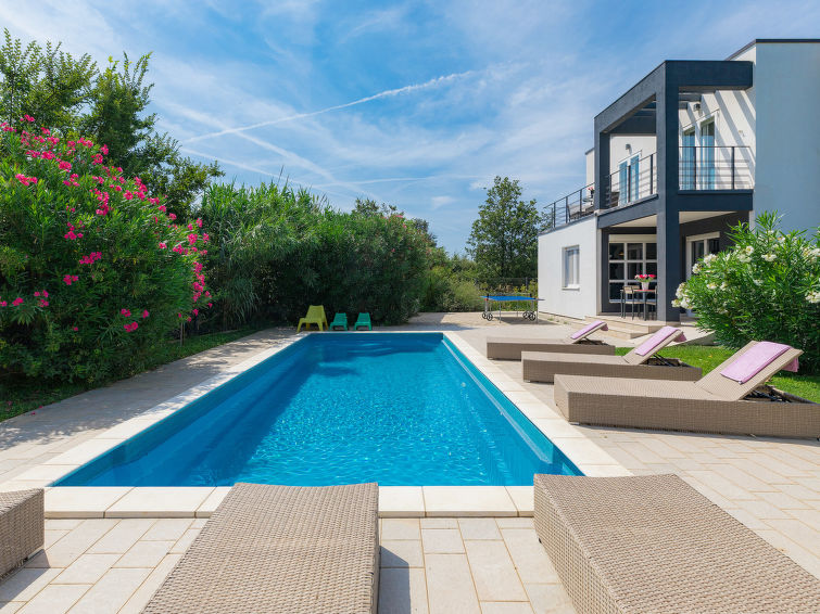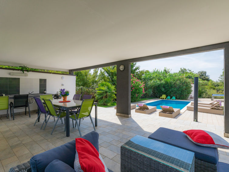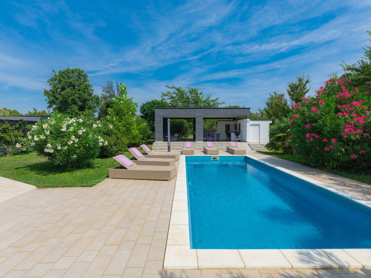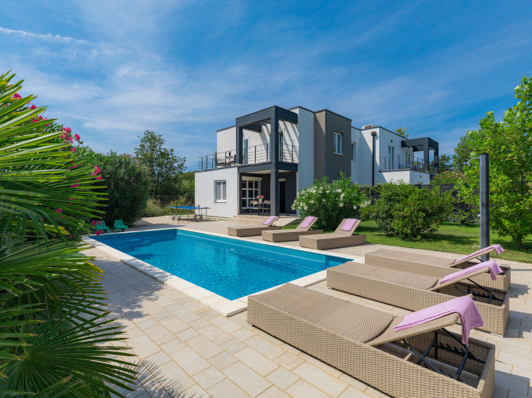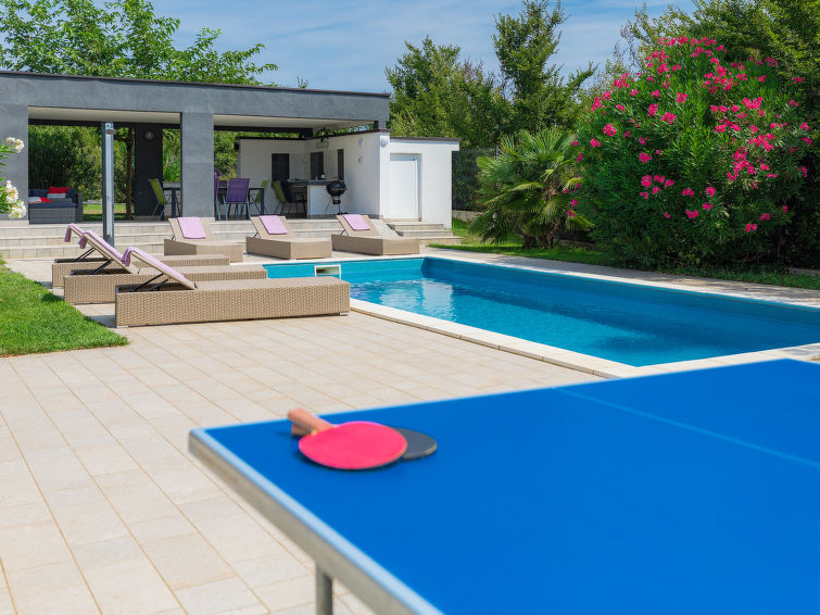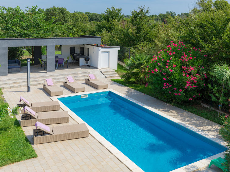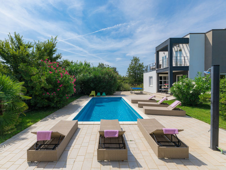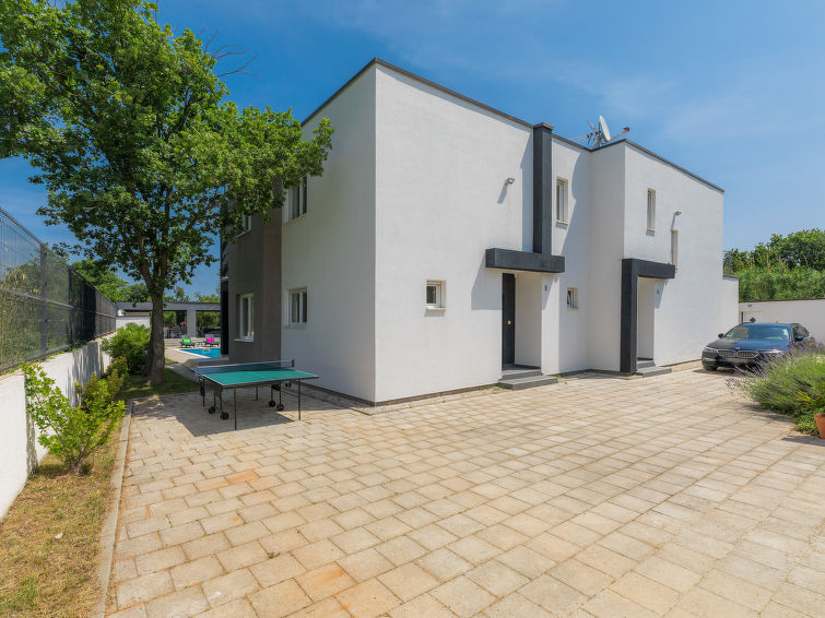 Moderne dobbelthus med 2 etasjer. 2 km fra sentrum av Medulin, 800 m fra sentrum av Ližnjan, 10 km fra sentrum av Pula, 1.4 km fra sjøen, 1.4 km fra stranden. Fellesbruk: lekeplass (rutsjebane, huske). Privat: tomt 700 m2 med plen, svømmebasseng (8 x 3 m, dybde 150 cm, Sesongåpent: 01.Mai. - 01.Okt.) med innebygde trapper. Utendørs dusj, bordtennis, terrasse, hagemøbler. I huset: internetilkobbling, alarm, vaskemaskin. Tilgang med bil hele veien til hbrukt (250 m naturvei). Parkering ved hbrukt. Butikk 400 m, småstenstrand 1.4 km, strand ved klipper 1.4 km. Eieren godtar ikke noen ungdomsgrupper.