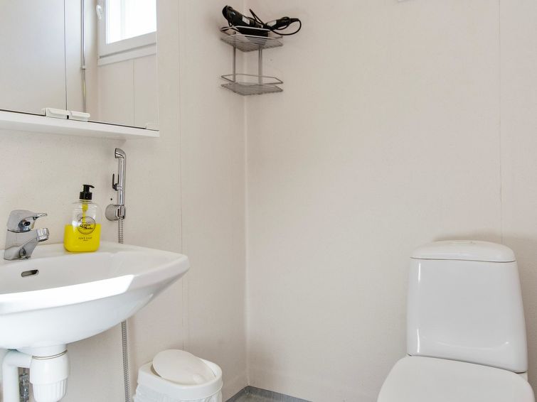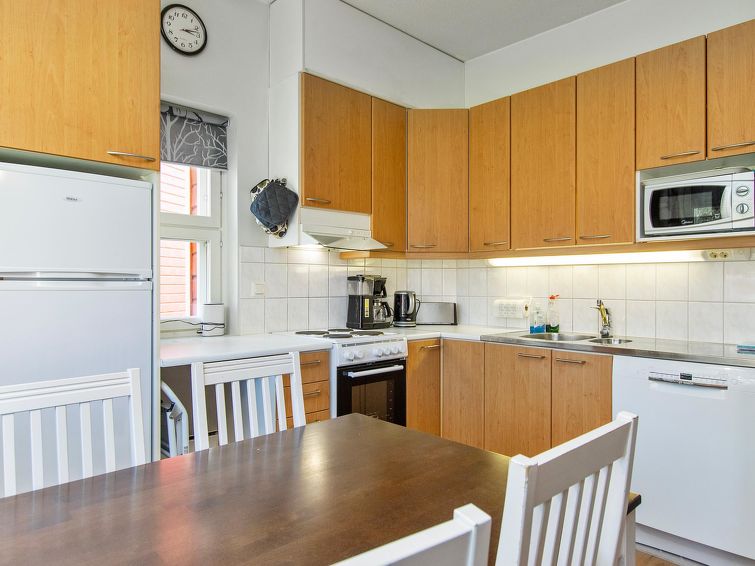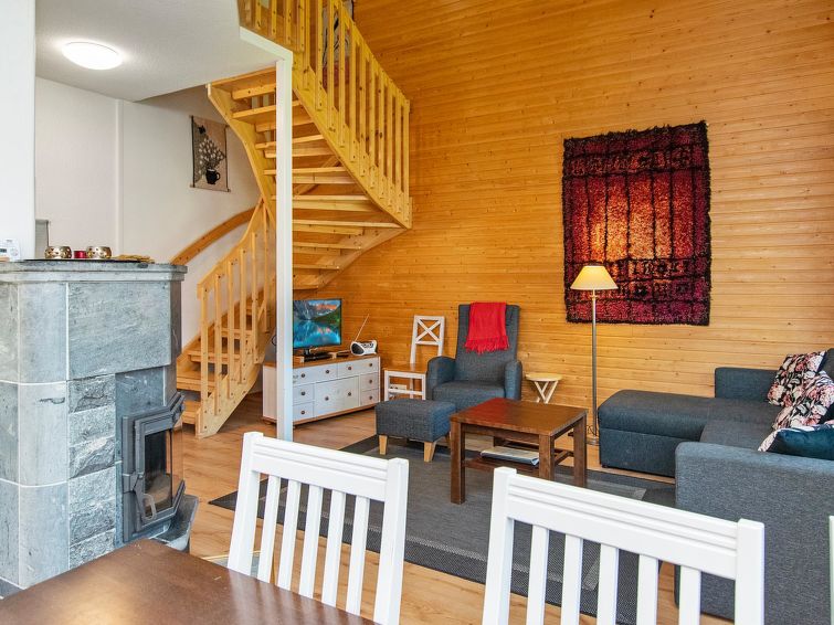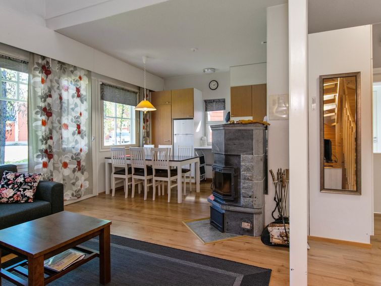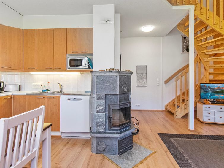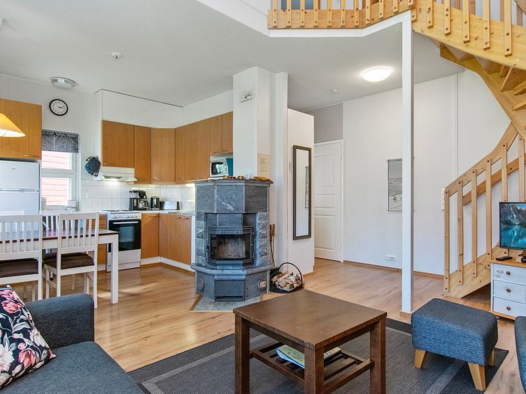 The kitchen living room has space for socialising as well as relaxing. A soapstone fireplace in the living room adds to the cosiness and warmth of the accommodation. There are spiral stairs from the living room to the upper floor.