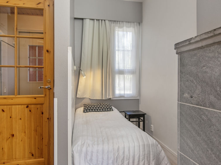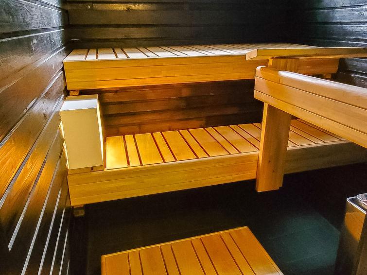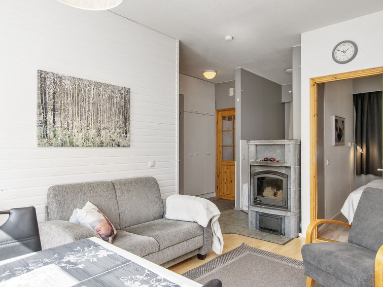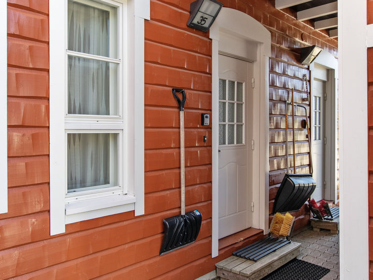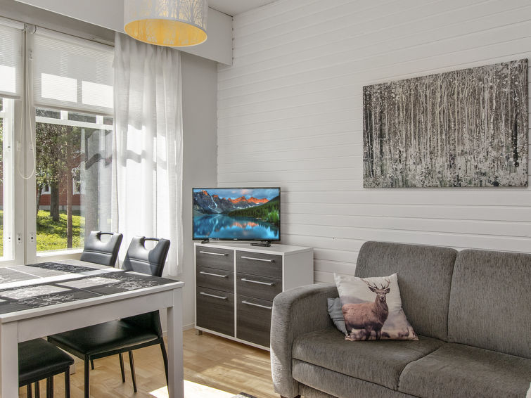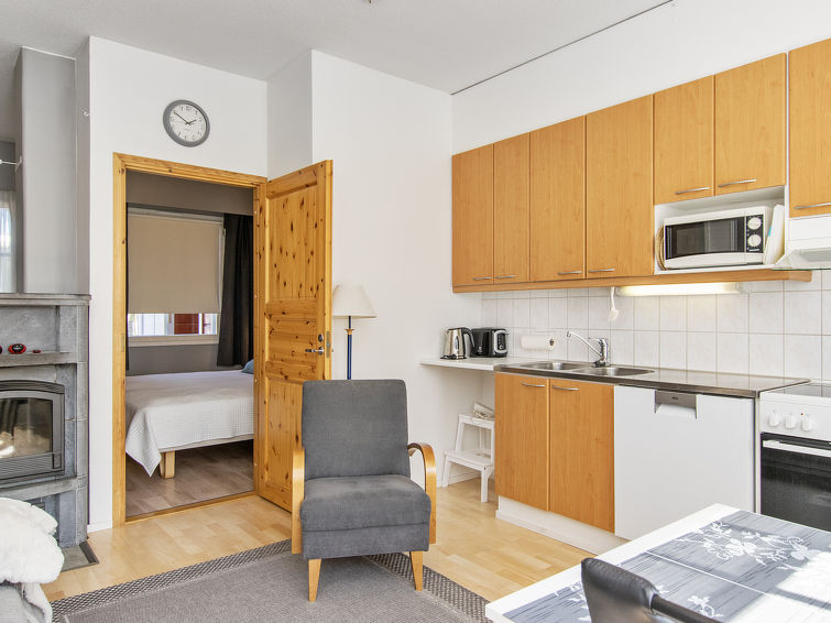 Street level apartment in the 2-storey row house in the center of Saariselkä. Built in 1999, renovated in 2016-17. Kitchen-living room with sofa bed, bedroom with 2 beds (width á 90 cm), alcove with 1 bed (width 80 cm), sauna and shower/toilet. The equipment also includes basic set of cutlery and cookware, coffee maker, water kettle, toaster, blender, waffle iron, iron and ironing board and hairdryer.