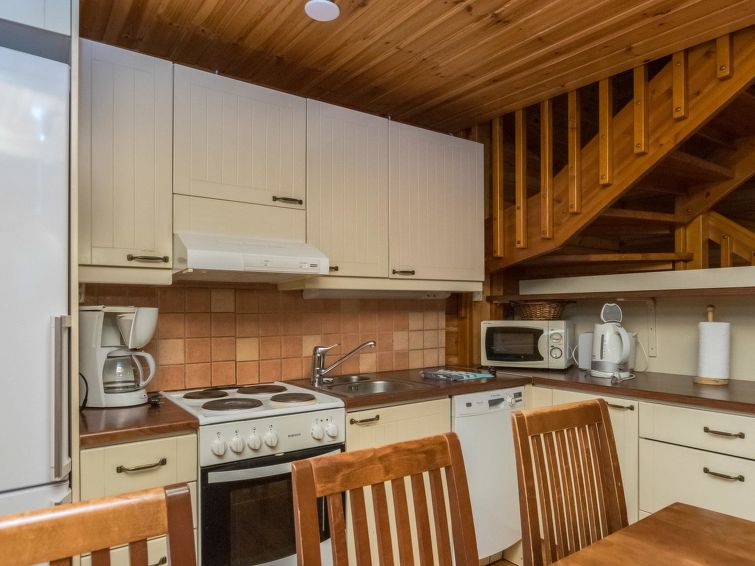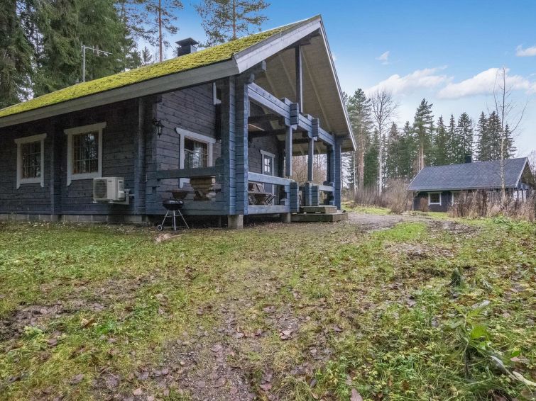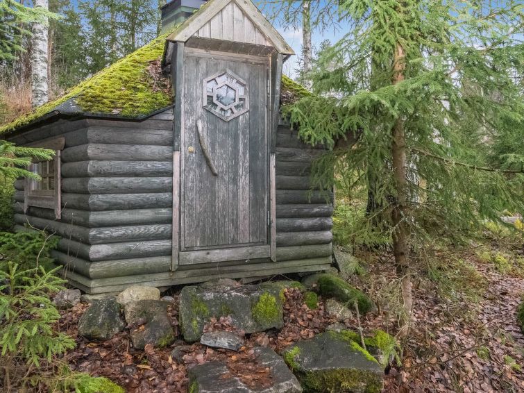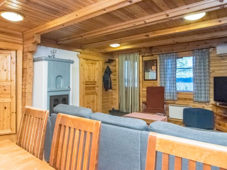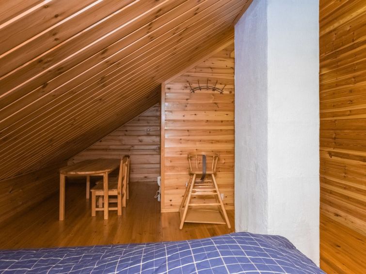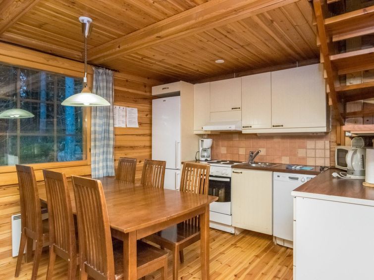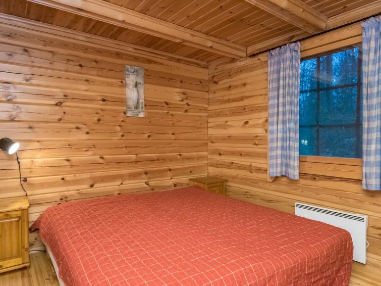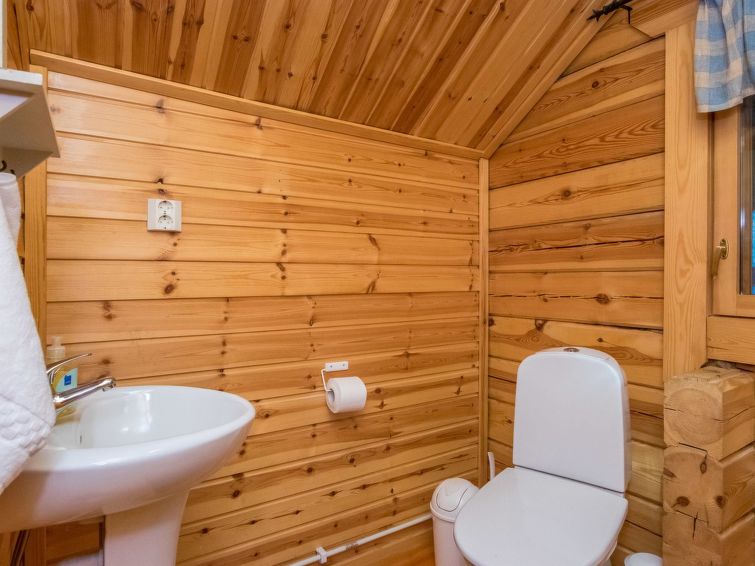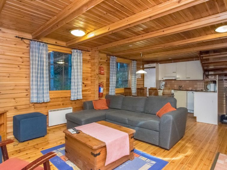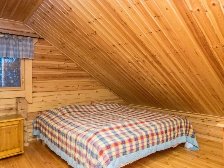 Log cabin 2006, living room / kitchen with sofa bed, 2 bedrooms with 2 beds in each (one downstairs, another upstairs), sleeping loft with 4 beds, wood-heated sauna, washroom, toilet downstairs and upstairs, covered porch.