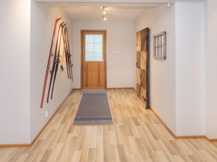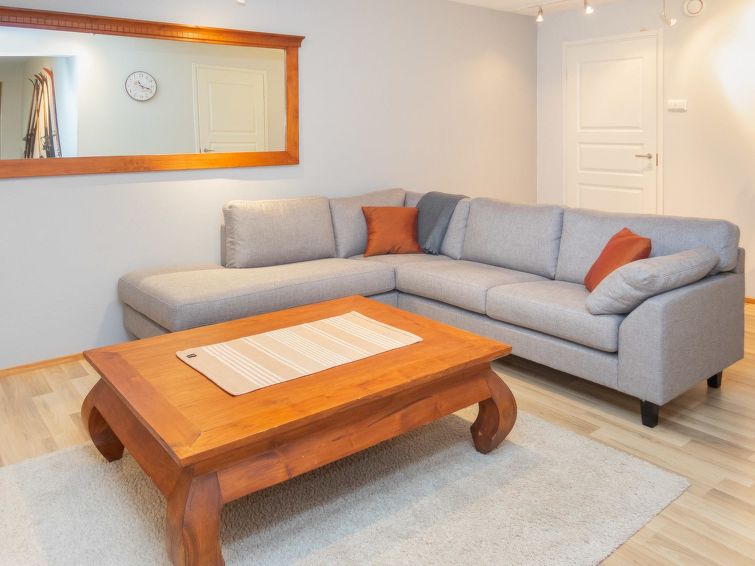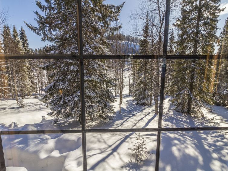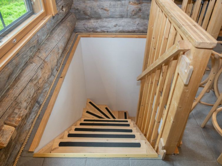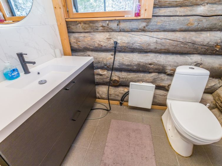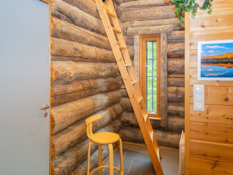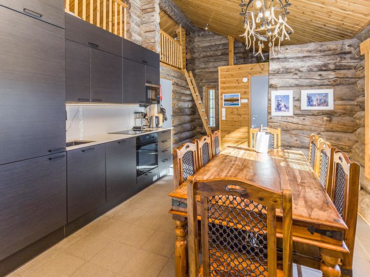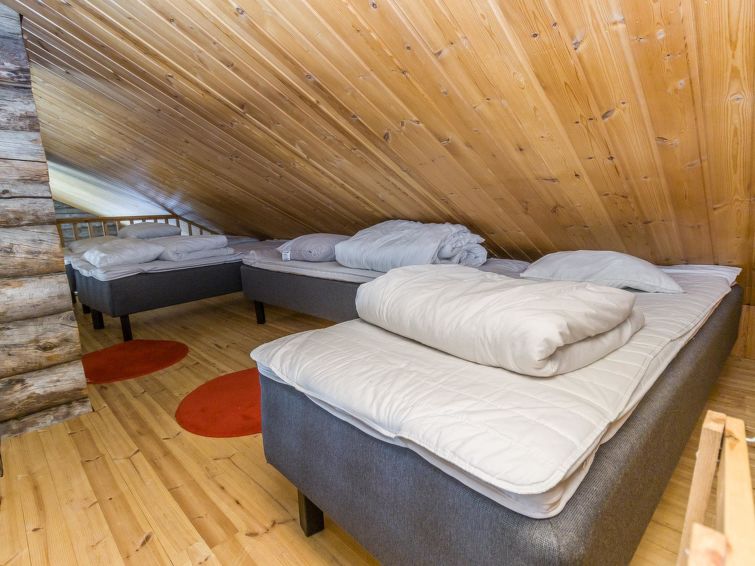 From Kuusamo 20 km to north, Ruka 8 km, Lake Ihtinkijärvi 25 m. Built in year 2009, Kelo-log cottage. Area of a room 194 m² of which a loft 14 m². 2 bedrooms, both with a with double bed. One bedroom with two beds. Loft (14 m²): futon mattress for 2 persons and 2 mattresses. Combined kitchen/living room. Television room and electric sauna downstairs. Spacious Kelo-log cottage is located in a peaceful place, near to Lake Ihtinkijärvi, own shore. Row boat. Surrounded by spruce forest. Cottage is suitable for families and firms. To Ruka about 10 minute's drive.