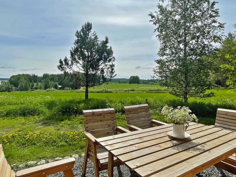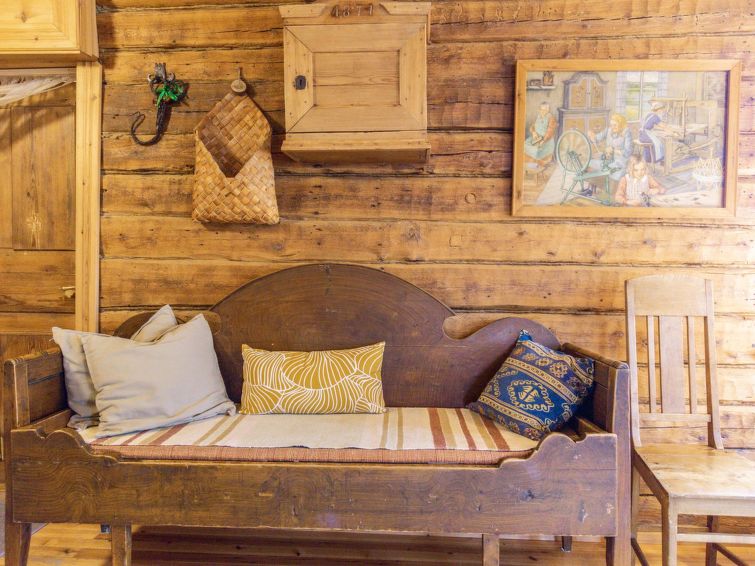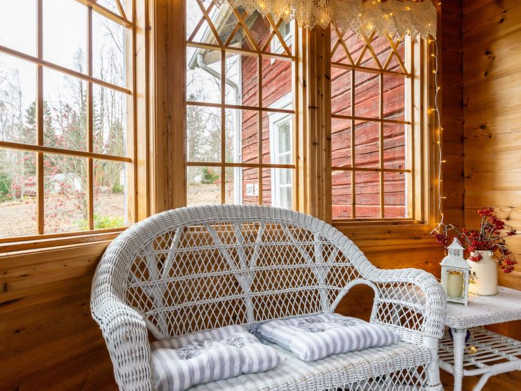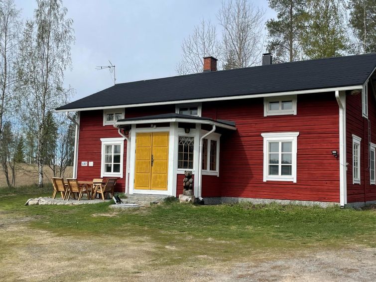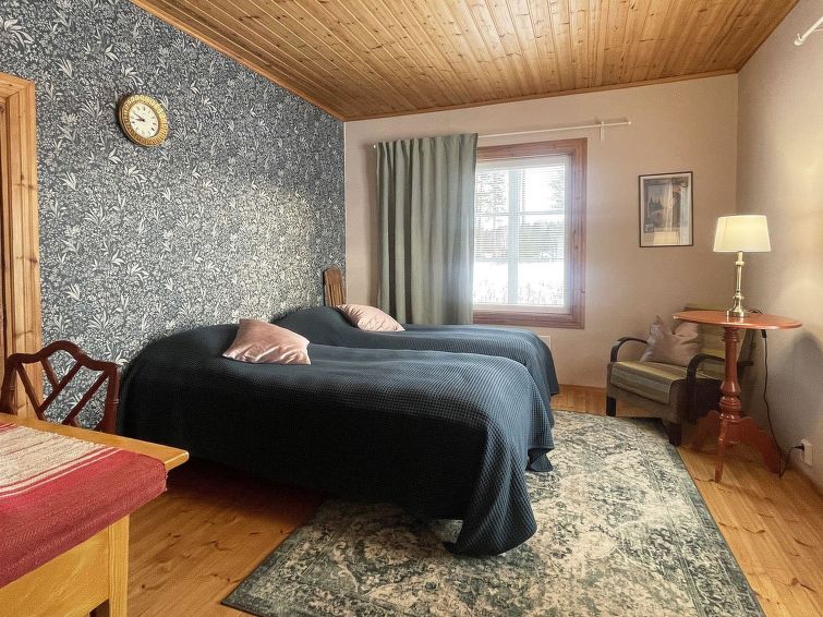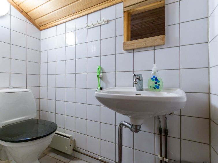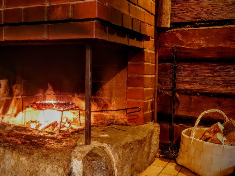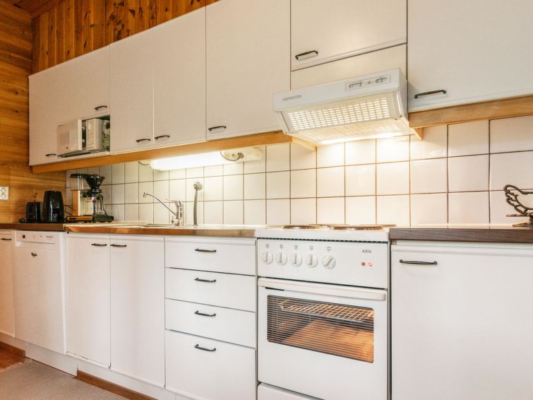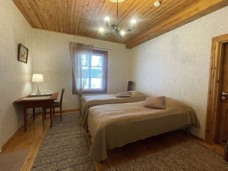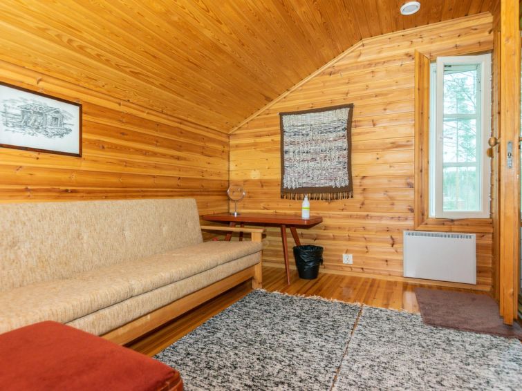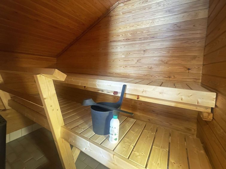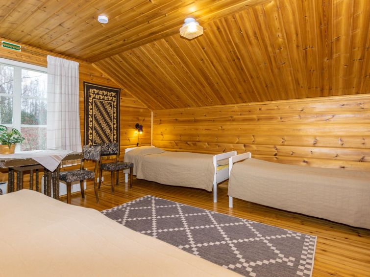 Log-built cabin. On the ground floor, spacious living room, kitchen, 2 bedrooms (both with two beds), WC with shower. On the upper floor, two bedrooms, one with two beds and another with double bed and two single beds, sauna (electric sauna stove), WC / washroom and dressing room. In the backyard, there is a covered cooking area with solid masonry grill.