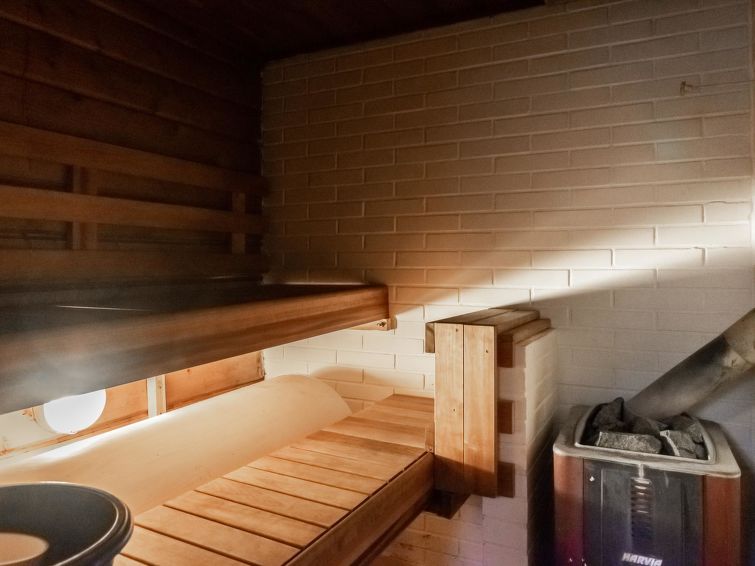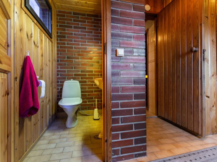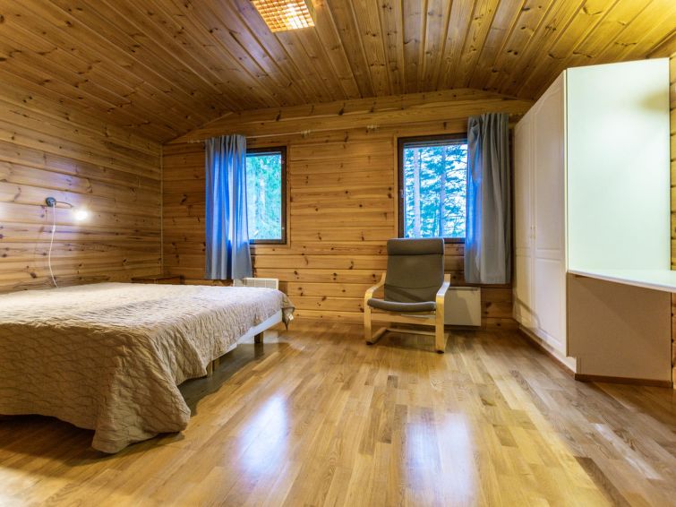 Wooden cabin with boarded outer walls (1993), living room (sofa bed 140x190 cm, bed for one), living room/kitchen, WC, two bedrooms, two beds in both. Sauna (wood-burning sauna stove), washroom with two showers.