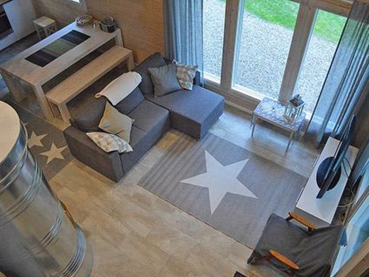 Log cottage, built in 2015, bright kitchen-living room, bedroom with double bed, bathroom, sauna, terrace. Spacious loft (30 m²) with two beds and sofa bed.