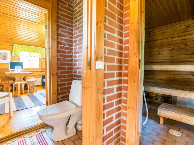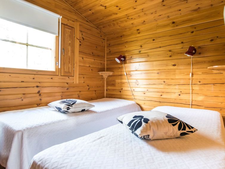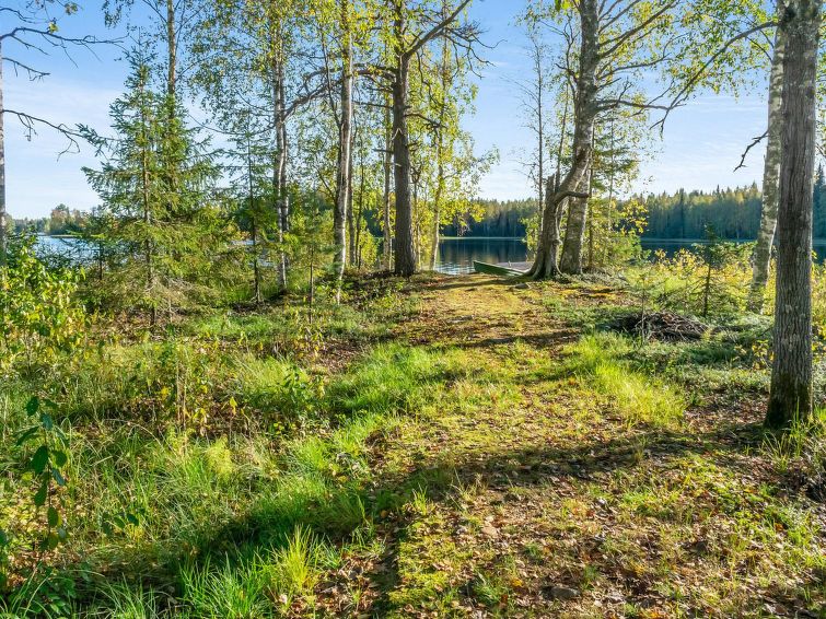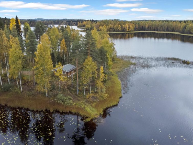 70 km east of Kuopio. Lake Vihtajärvi 20 m (length 4 km, breadth 1 km), beach 80 m, shallow water, firm sanded clay bottom. Pier, own boat. Log cabin 1993, living room/kitchen, 2 bedrooms with 2 beds in each, dressing room, sauna, open veranda.