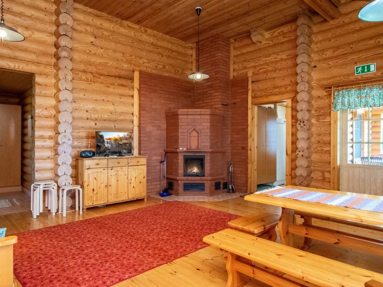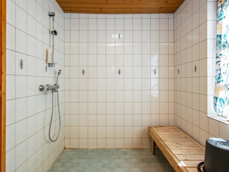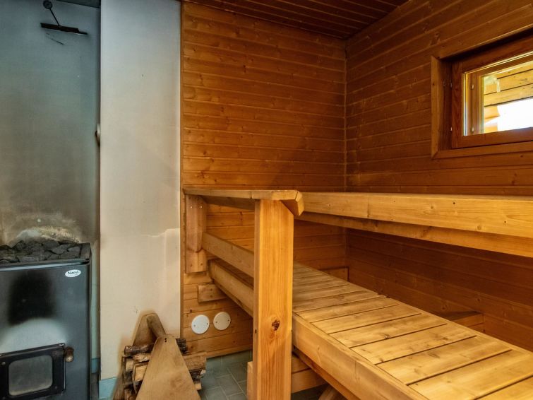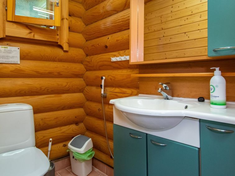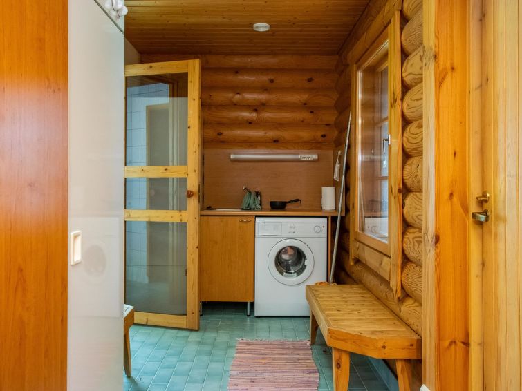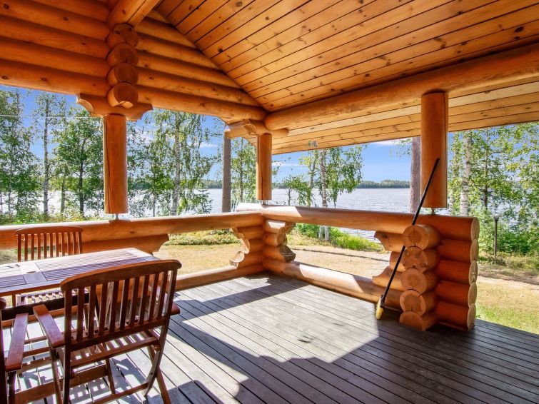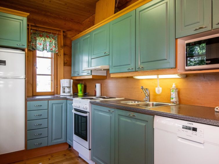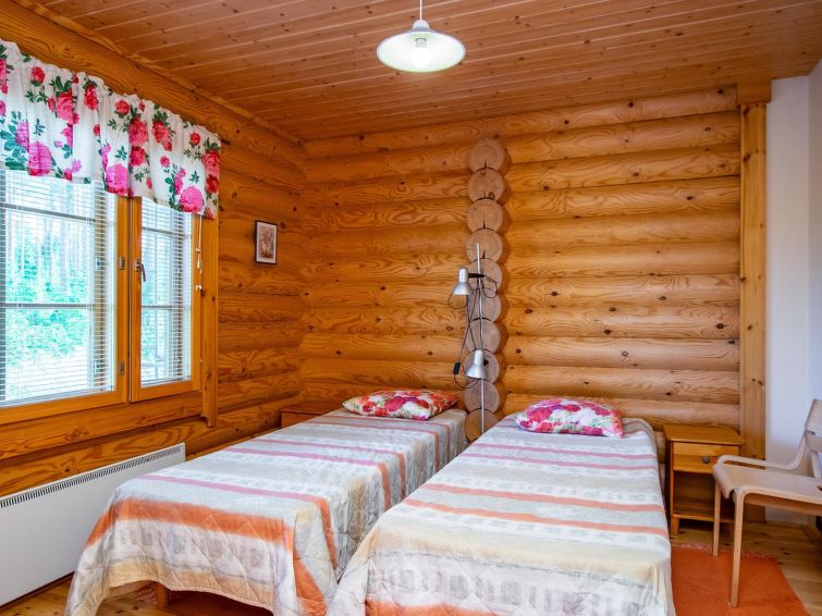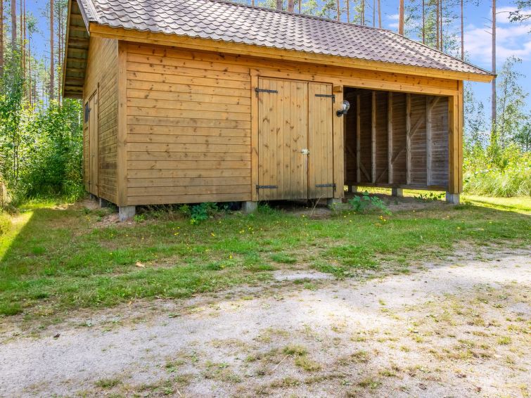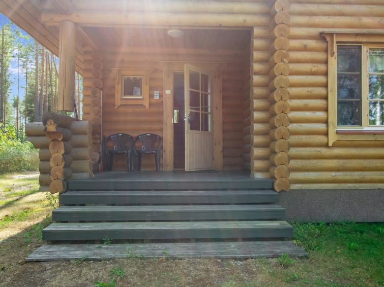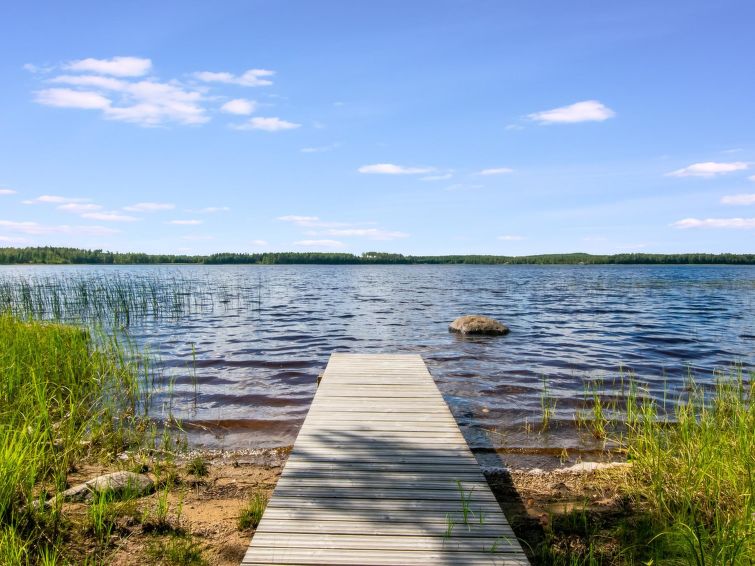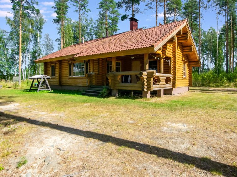 45 km west of Savonlinna, Halmejärvi 20 m (length 5 km, width 1 km); shallow, hard sanded bottom, own boat. Log building 2000, kitchen, living room with convertible sofa, 2 bedrooms 2 beds in each, dressing room, washroom, sauna, 2 x open porch. Hasanmäki downhill ski centre 35 km, horse riding 15 km. Outboard motor for hire. Owner gives instructions where to rent canoes.