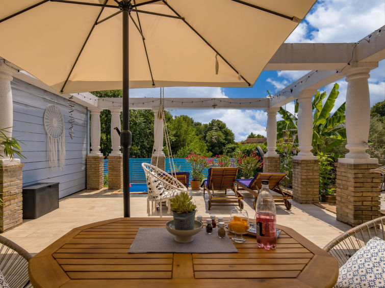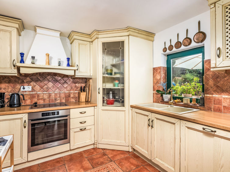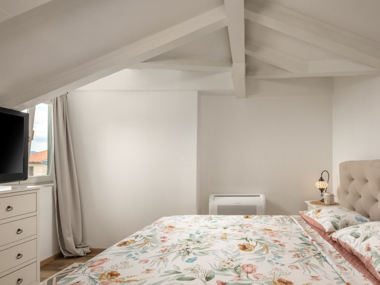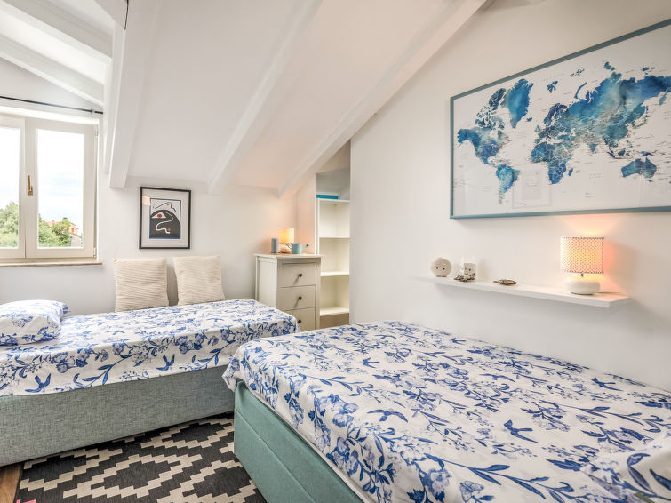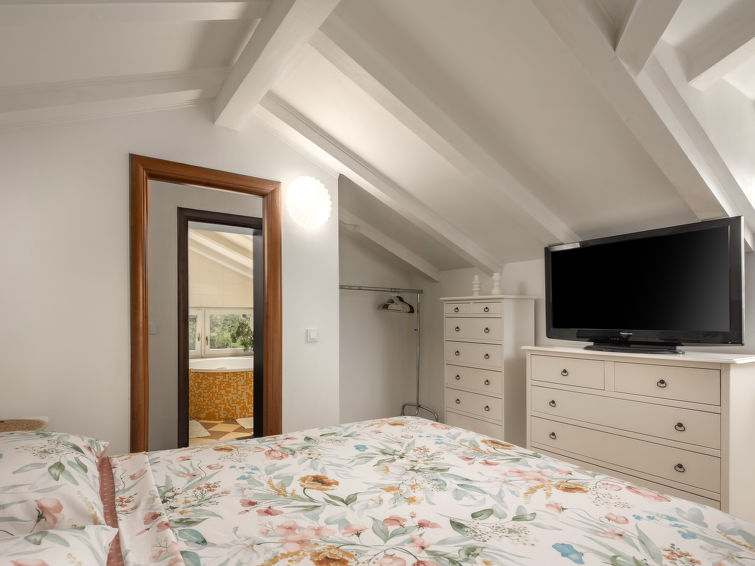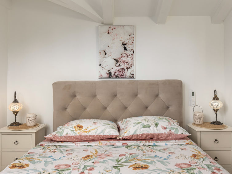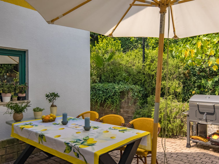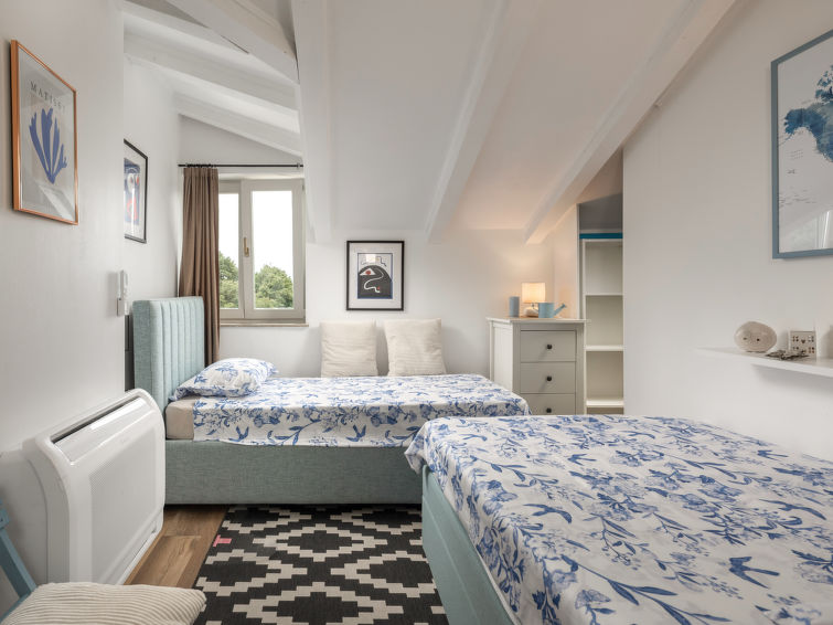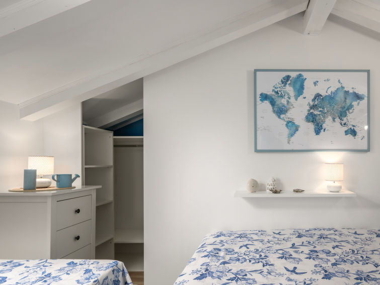 3 rom halvpart av tomannsbolig 110 m2 i 2nd etasje. Vakkert og smakfullt møbler: stue/spisestue med, satelit-TV og air-conditioning. Utgang til balkongen. Åpent kjøkken (stekeovn, oppvaskmaskin, 4 keramiske kokeplater, frys, elektrisk kaffemaskin). Sep. WC. Toppetasje: inngang med skråtak, Lav dørhøyde 160 cm 240 cm. 1 rom med skråtak Lav dørhøyde 160 cm 240 cm med 2 senger (90 cm lengde 200 cm). 1 rom med skråtak Lav dørhøyde 160 cm 240 cm med, 1 dobbeltseng (2 x 90 cm, lengde 200 cm). Bad/WC. Oppvarmingsalternativ. Balkong 12 m2, terrasse 42 m2. Liggestoler. Delvis utsikt av havet. Fasiliteter: hårføner. Internett (trådløs LAN [WLAN], gratis). 1 lite kjæledyr / liten hund tillatt.