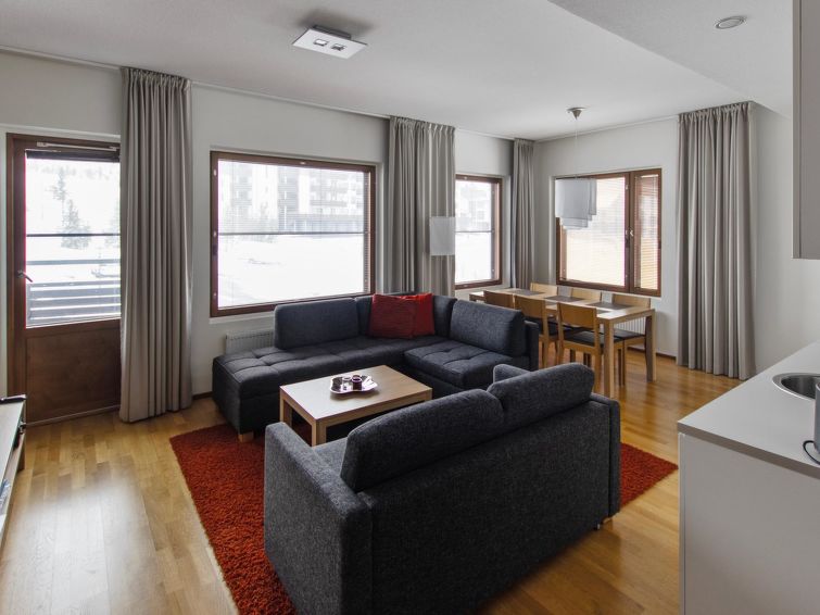 High-quality ski-in-ski-out apartment, built in 2009, situated in Ylläsjärvi village, in Ylläs Ski Resort. The apartment is located right next to the gondola lift station, restaurant Taiga and spa hotel Saaga. The destination offers easy access to the ski slopes, ski trails, hiking trails and nighttime activities. The apartment is located on the 3rd floor of the building, with a view towards the fell. Living room/kitchen, two bedrooms with two single beds, sofa bed for two, electric sauna, washing room, separate WC