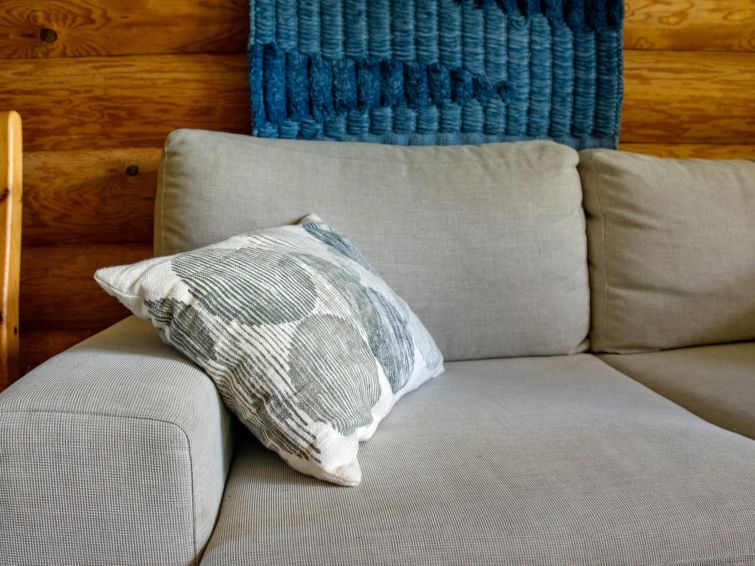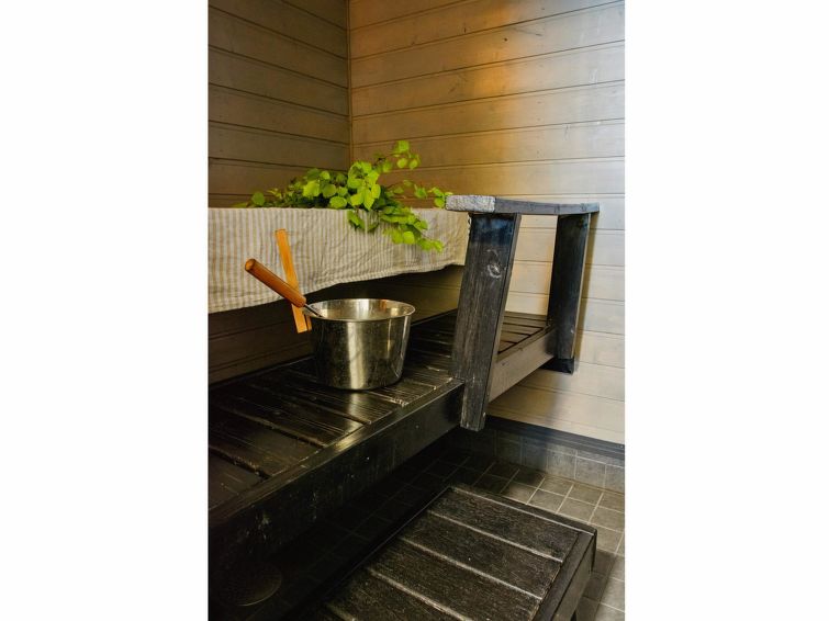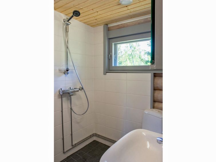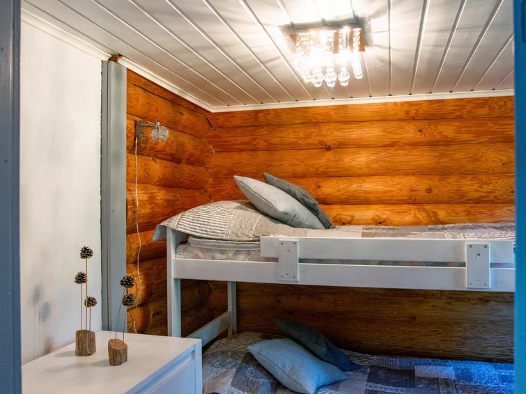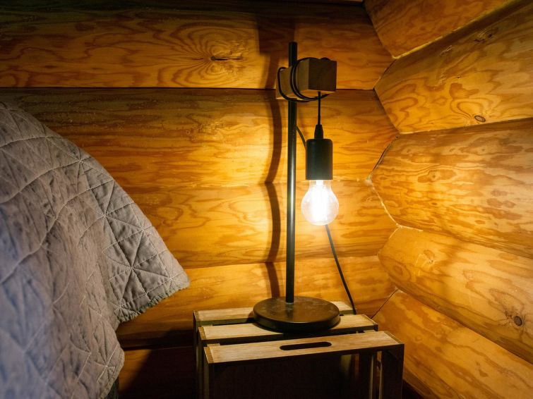 Log cabin 1989, living room/kitchen with 2 extra beds in sofa bed, kitchenette, bedroom with double bed, bedroom with bunk bed, washroom (toilet), sauna (with electric sauna stove), veranda. Access to WC and sauna from outside.