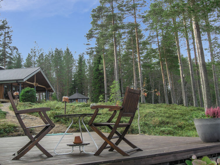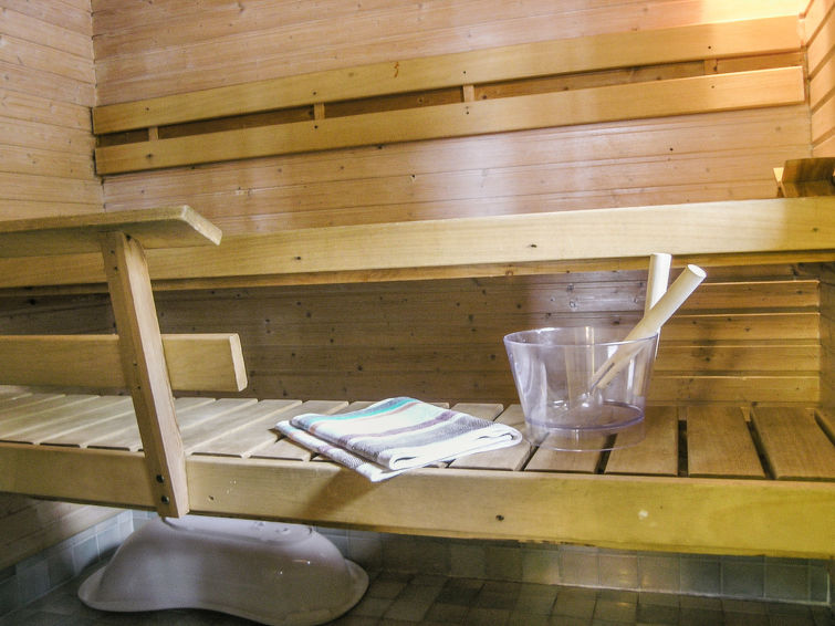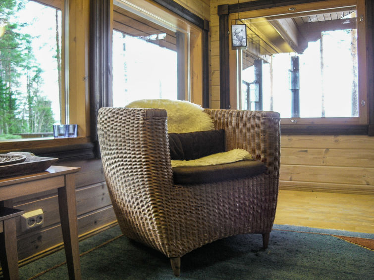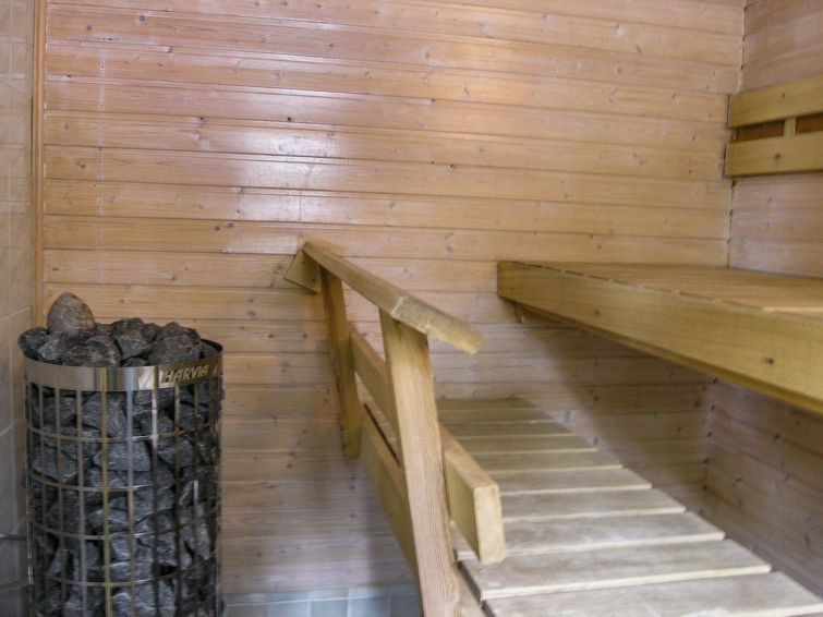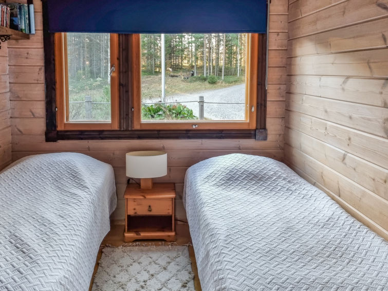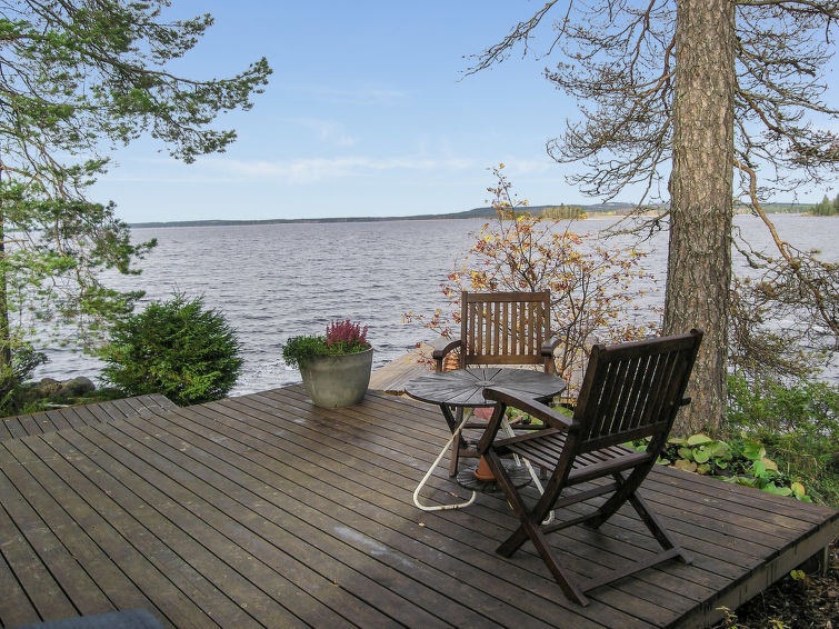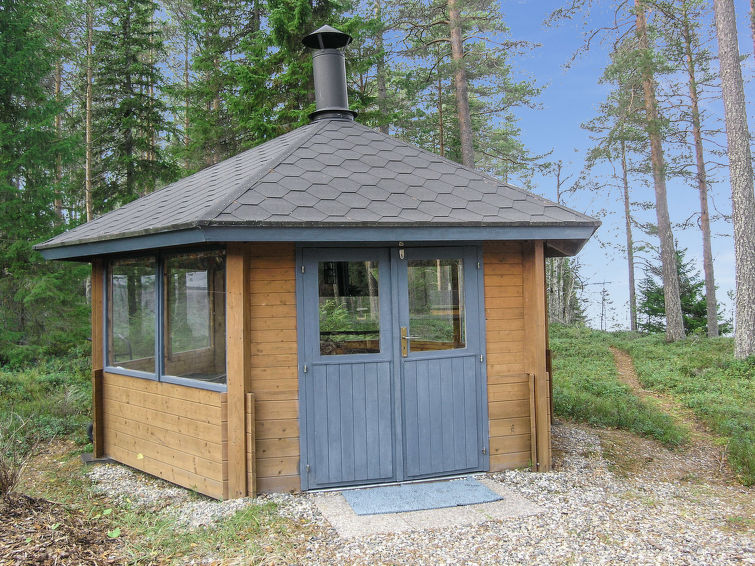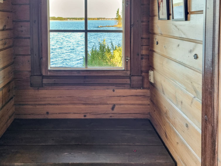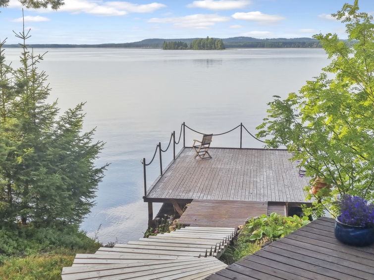 29 km east of Kajaani, Lake Nuasjärvi 30 m (length 30 km, width 5 km), fairly deep shore, hard moraine/ sand bottom, own boat. Log cottage 1999, living room/ kitchen, 2 bedrooms double bed in each, sleeping loft 2 beds, washroom, sauna (elec. stove), open porch. Lakeshore sauna (12 m²) with dressing room, sauna with elec. light, water must be carried to the lakeshore sauna from standpipe or from the bathroom of the main building during October-April. High quality, elegant cottage, with plenty of space in living room area. Located on shore of large waterway, opposite shore 5 km. Well maintained plot on slope, steps from lakeshore sauna to jetty. Peaceful location. Vuokatti 3.5 km and Katinkulta by boat 2 km, by road 6 km. Nuasjärvi is well stocked with fish. Neighbouring cottage is 8105.